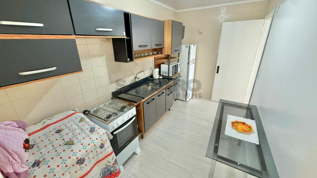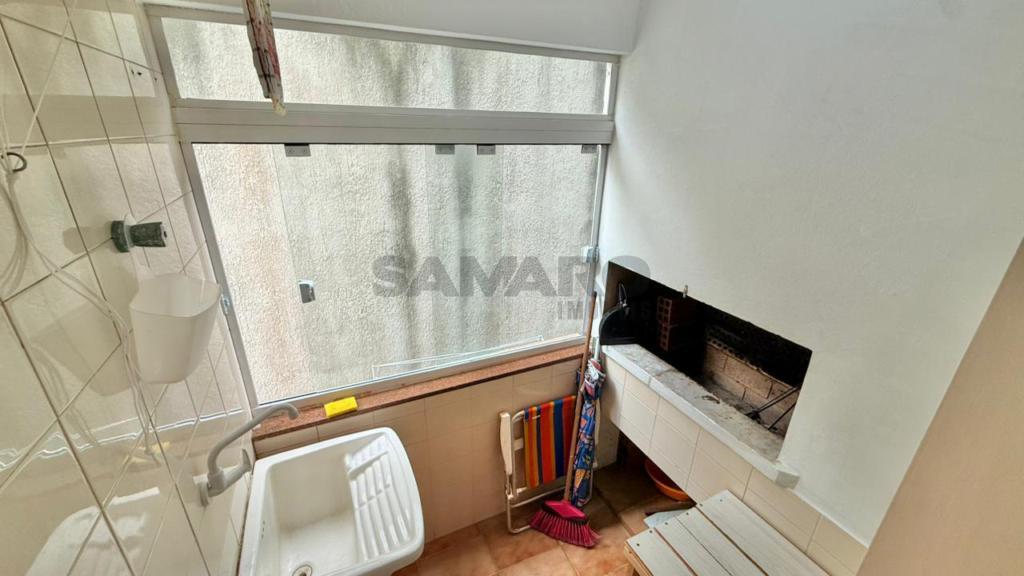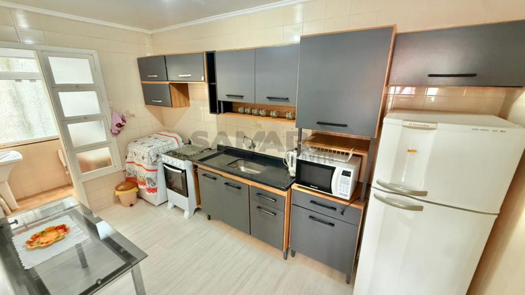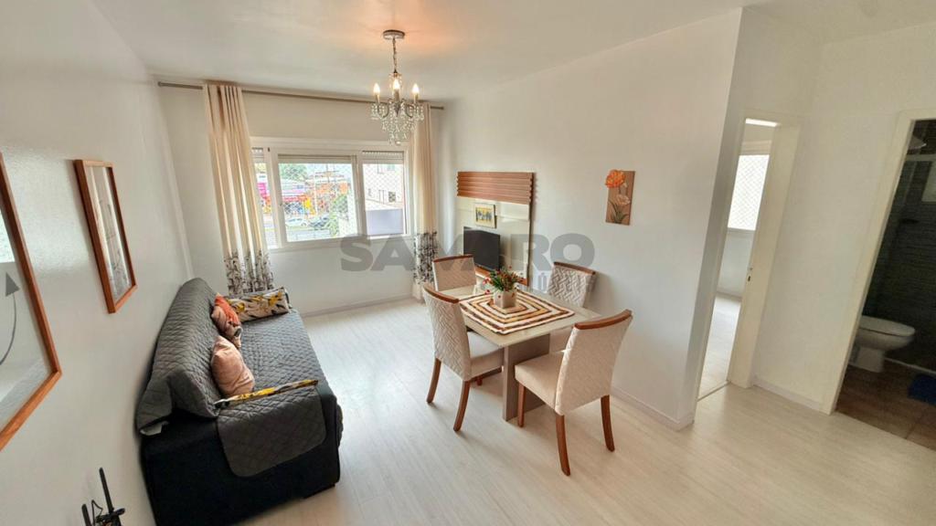 Apartamento de 01 quarto, living em dois ambientes, cozinha, churrasqueira, área de lavanderia e banheiro social.