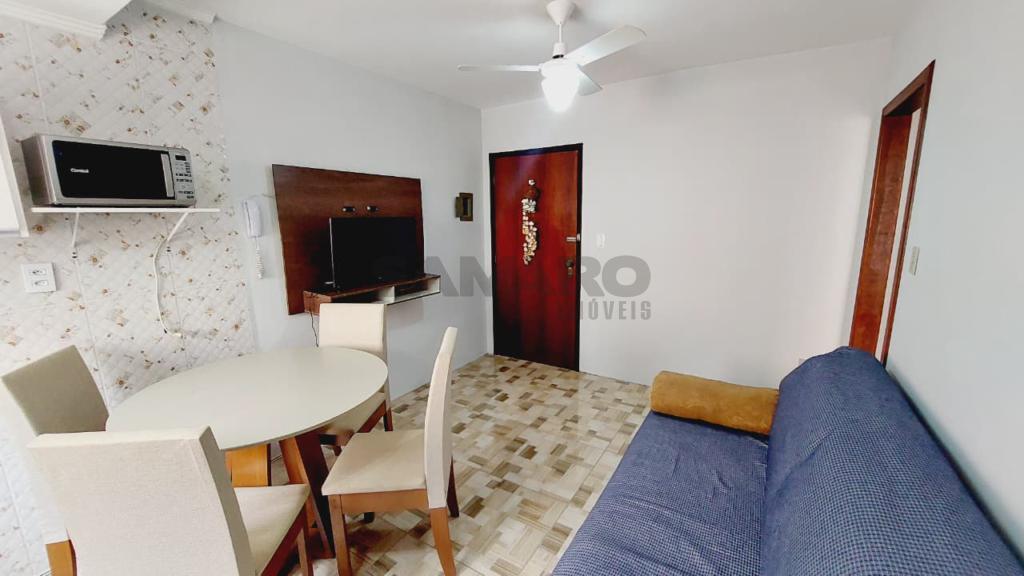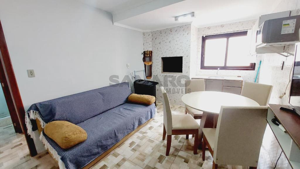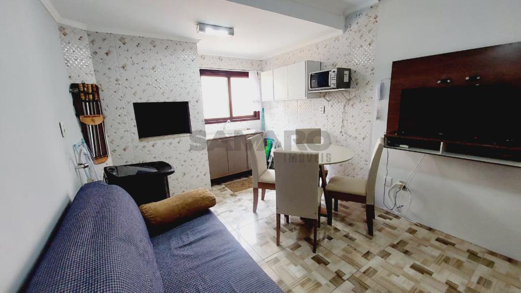 Apartamento composto por 1 quarto, living em 2 ambientes, cozinha estilo americana, churrasqueira e banheiro social.