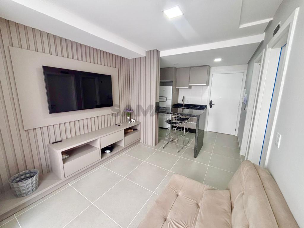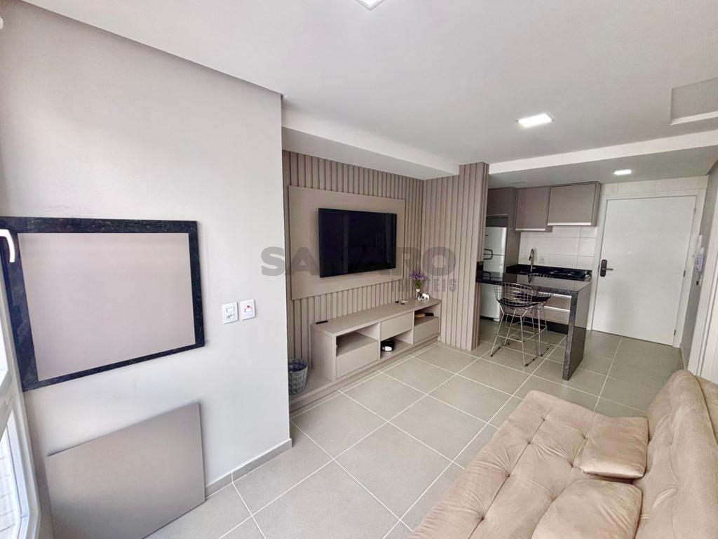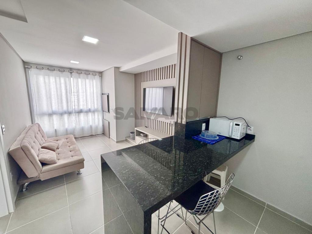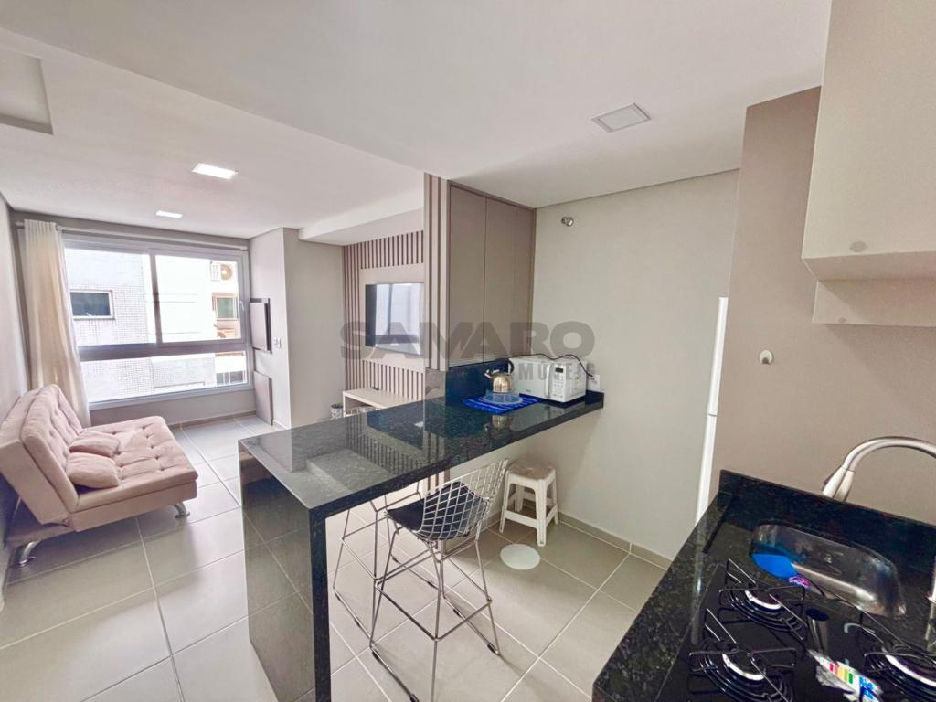 Apartamento de 1 dormitório, living em dois ambientes, cozinha estilo americana, churrasqueira, lavanderia, banheiro social, uma vaga de garagem, espera para água quente e ar condicionado split, medidores de água e gás individuais.