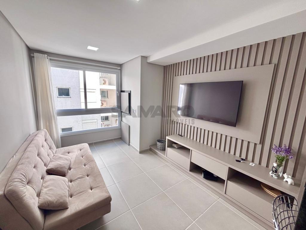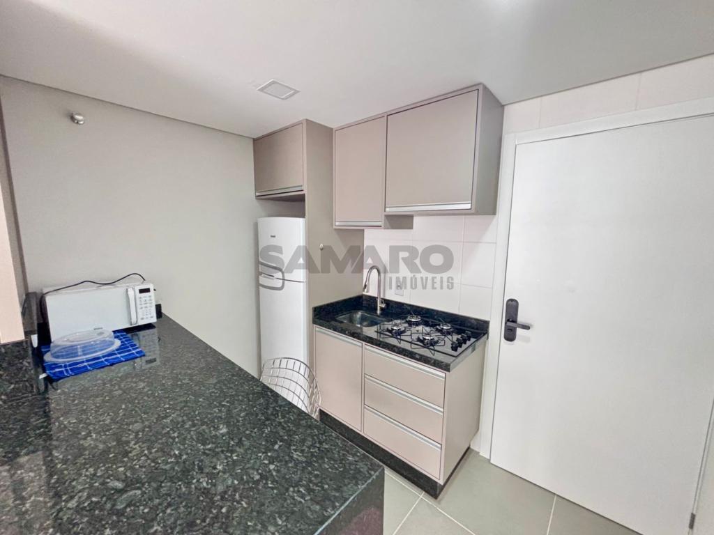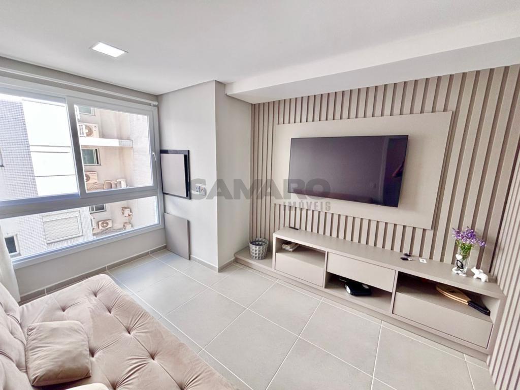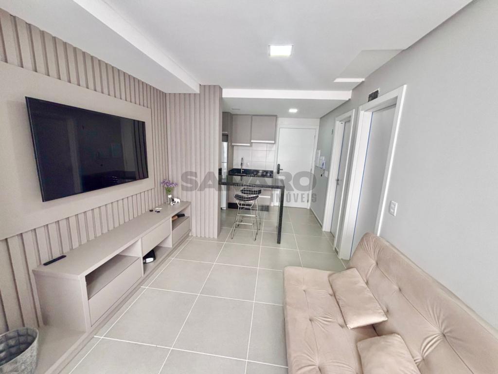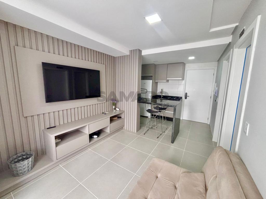 Apartamento de 1 dormitório, living em dois ambientes, cozinha estilo americana, churrasqueira, lavanderia, banheiro social, uma vaga de garagem, espera para água quente e ar condicionado split, medidores de água e gás individuais.