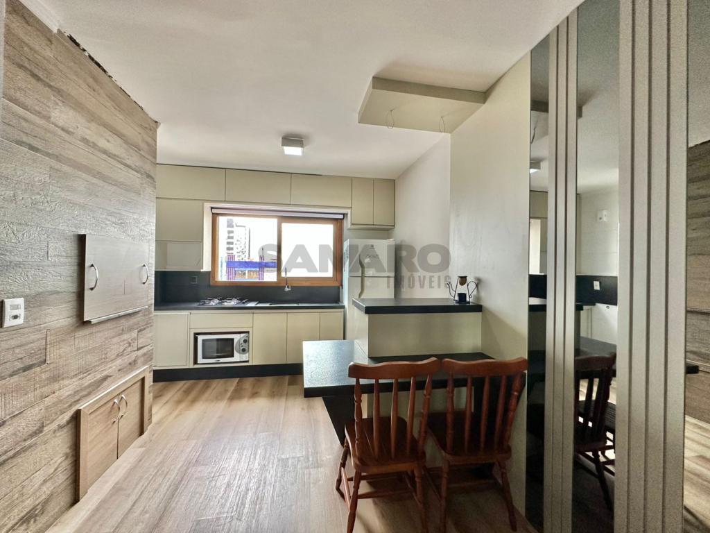 Apartamento de 1 dormitório amplo, cozinha estilo americana, banheiro social, living em dois ambientes, churrasqueira, mobiliado box para carro.