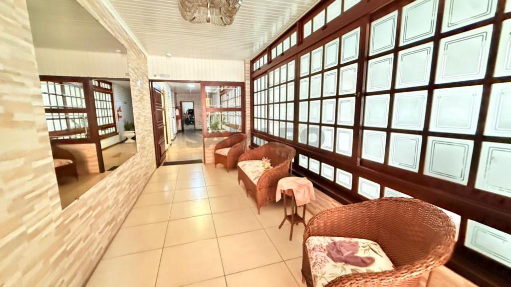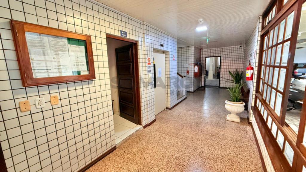 Prédio com portão e porteiro eletrônicos, elevador, câmeras de segurança, hall decorado.