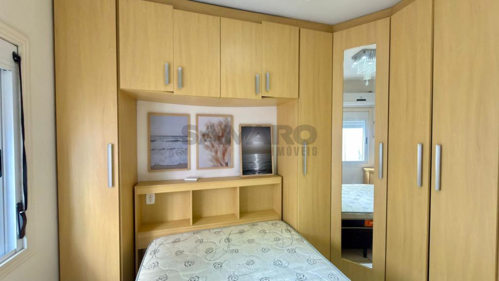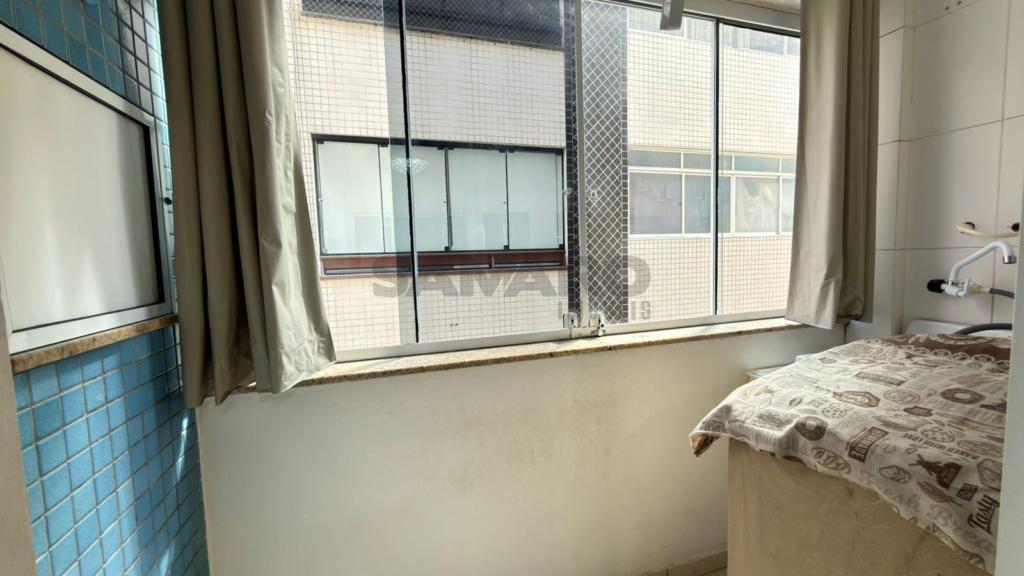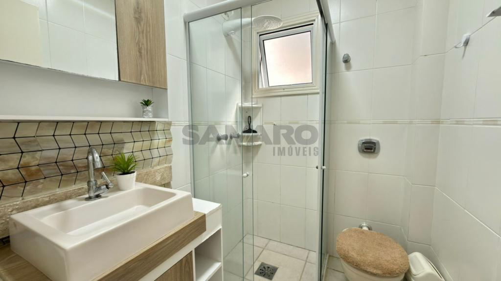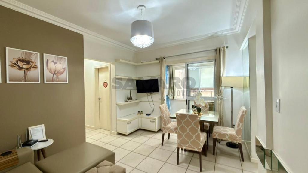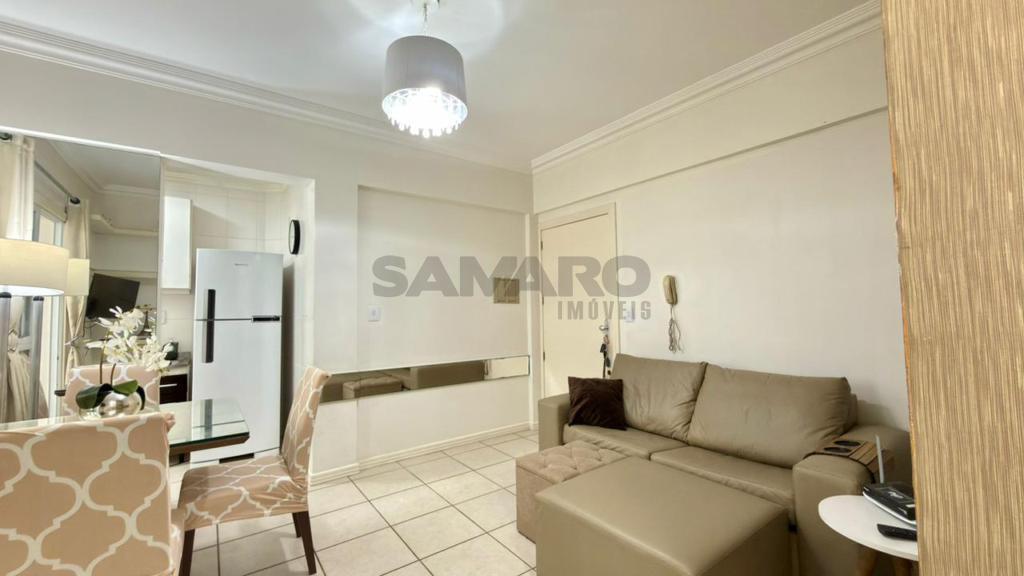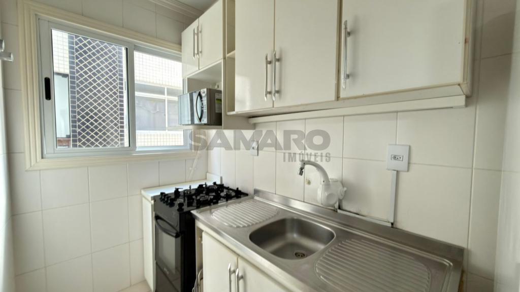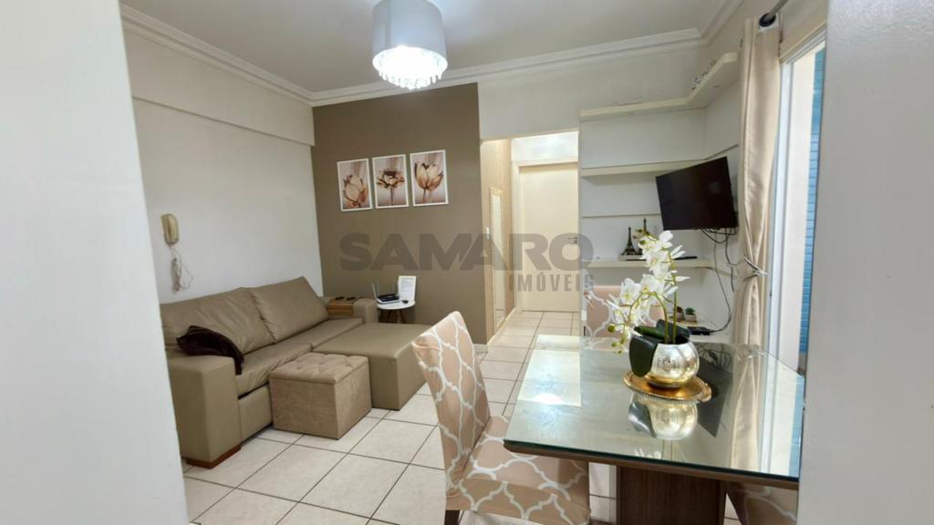 Apartamento de um quarto, living em dois ambientes, cozinha, churrasqueira, área de lavanderia, banheiro social e uma vaga de garagem.