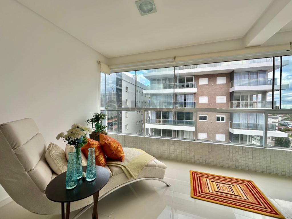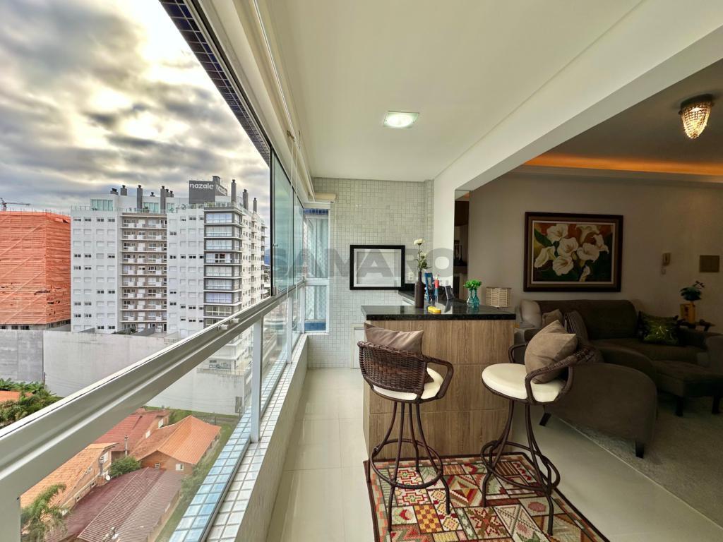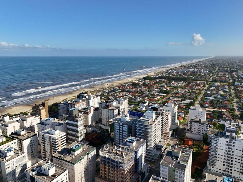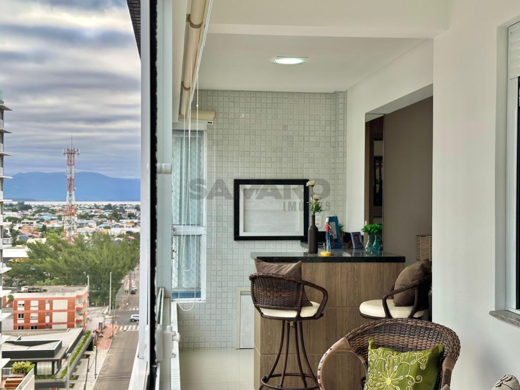 Andar alto e vista para mar e Atlântida. Sacada de frente com churrasqueira, 2 dormitórios com suíte e banho social, cozinha separada e área de serviço, espera para split em todas as peças, água quente, gás central, edifício com 2 elevadores, hall de entrada mobiliado e decorado, salão de festas e garagem para carro.