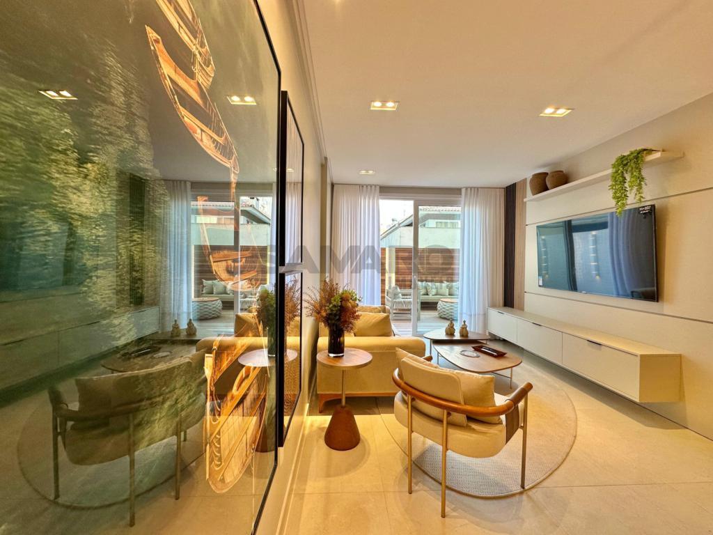 Apartamento com 02 dormitórios, suite, banheiro social, living em dois ambientes, cozinha americana, lavanderia, terraço, churrasqueira, vaga de garagem, mobiliado e decorado.