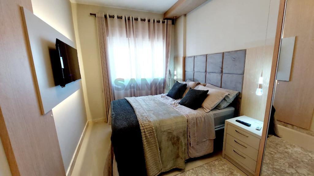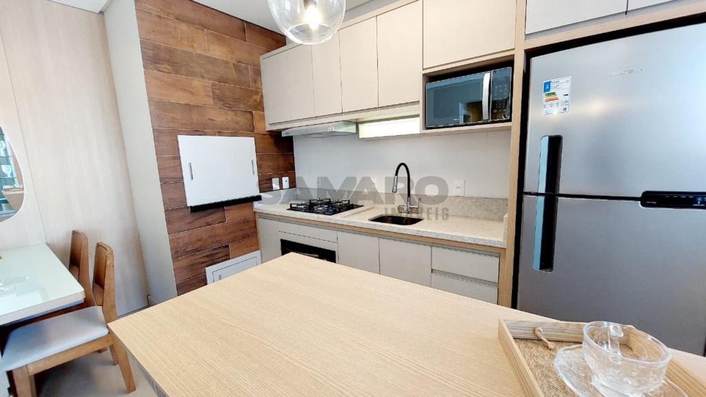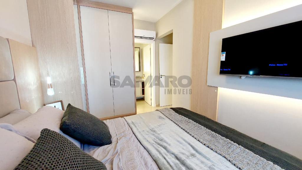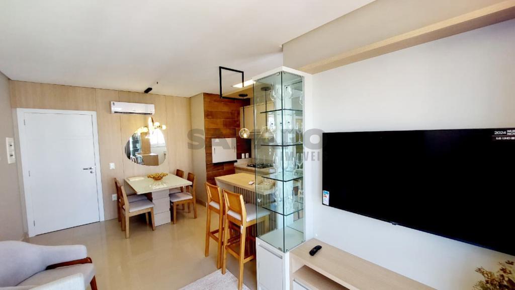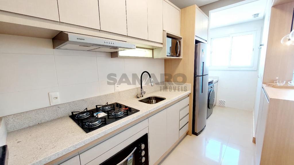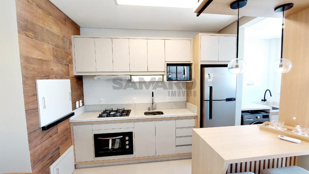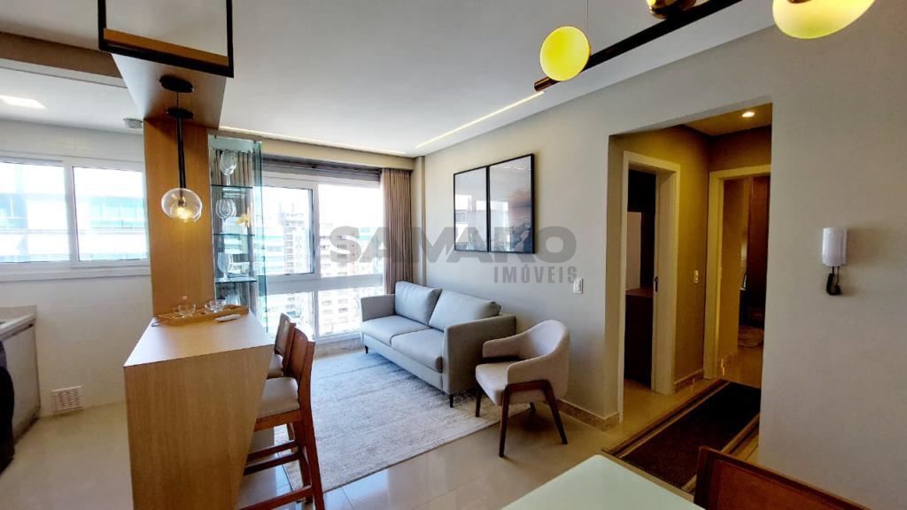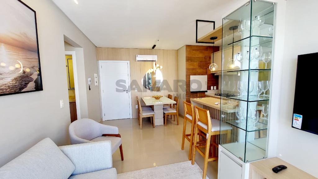 Apartamento novo, nunca habitado, mobiliado e decorado, de frente, dois quartos (sendo um suíte), banheiro social, living em dois ambientes integrados, cozinha estilo americana, churrasqueira, área de lavanderia separada, uma vaga de garagem, espera para ar condicionado split e água quente, posição solar oeste, medidores de água e gás individuais.