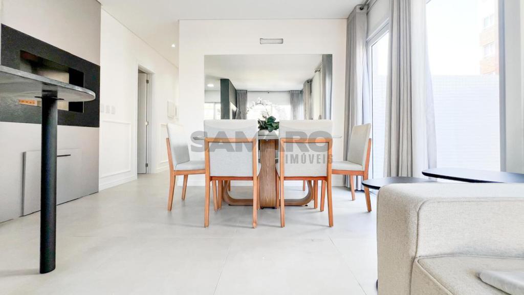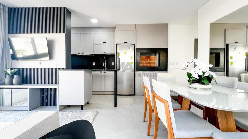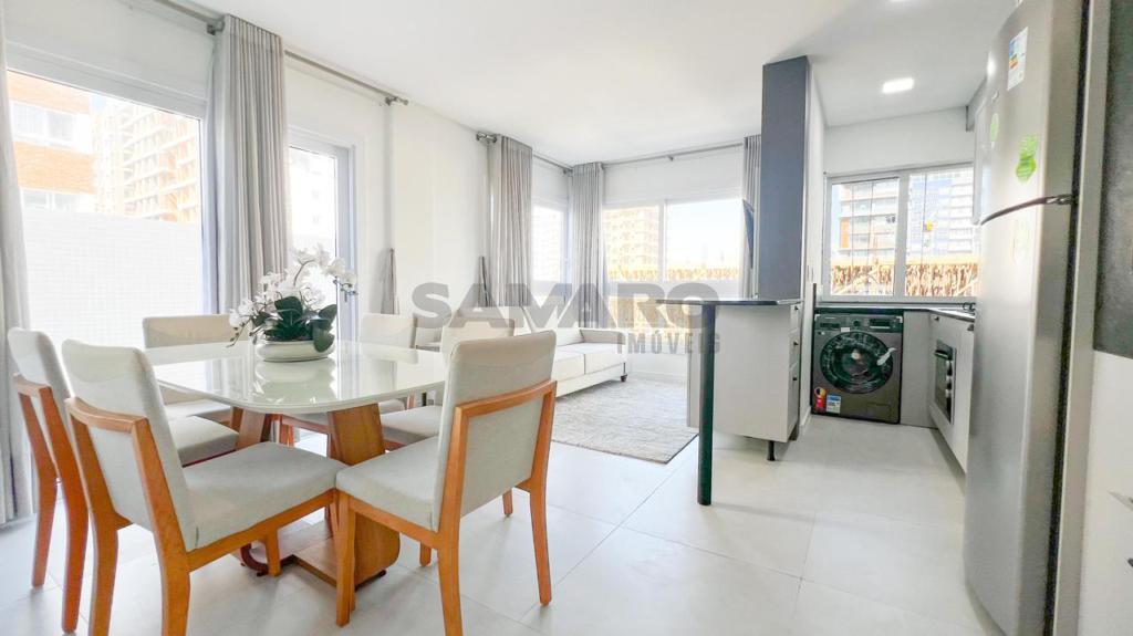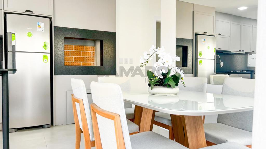 02 dormitorios, 02 suíte, banheiro social, living estar, jantar, cozinha estilo Americana com churrasqueira, lavanderia separada, mobiliado, uma vaga de garagem.