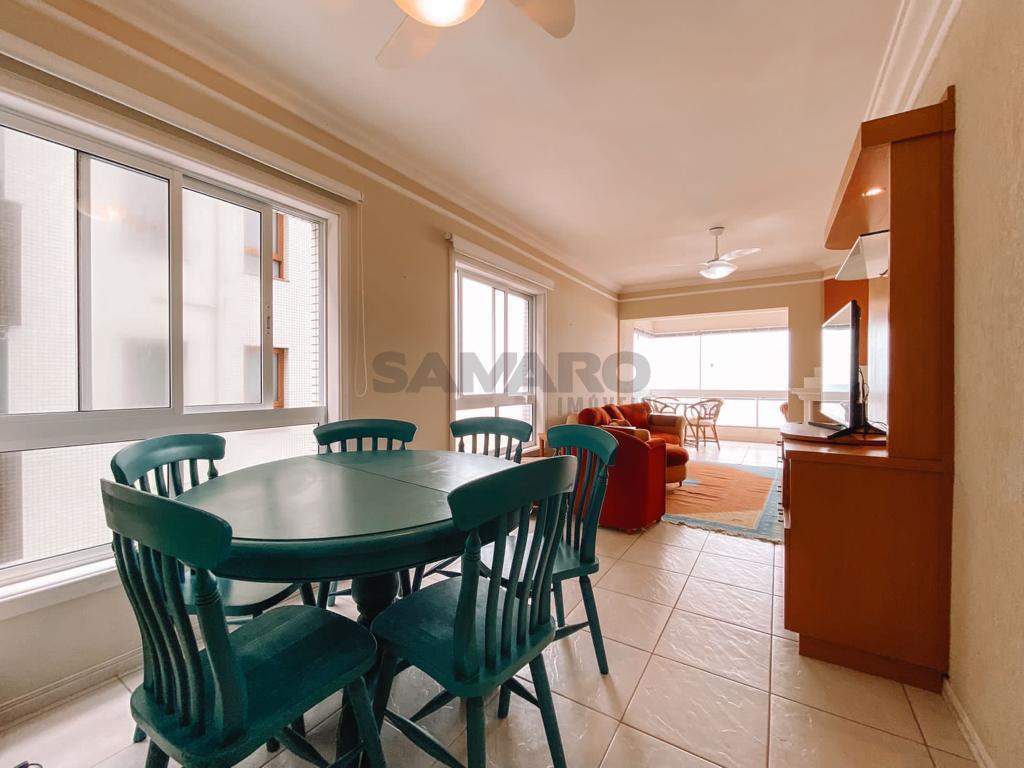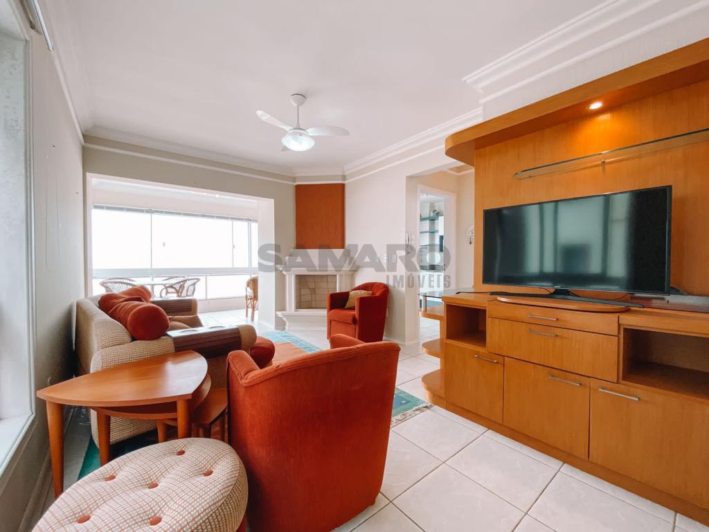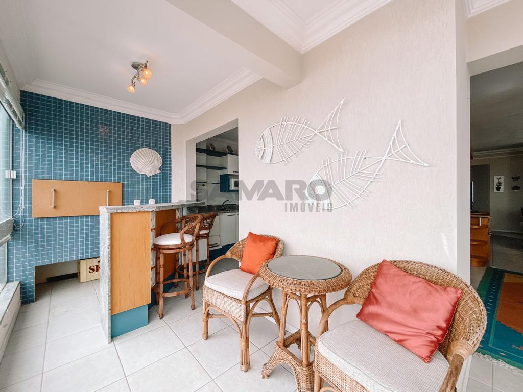 Sacada de frente com churrasqueira e vista eterna mar, apartamento 3 dormitórios, sendo um suíte master, banho social, lavabo, sala de estar e jantar com lareira, cozinha, lavanderia separada, garagem, mobiliado.