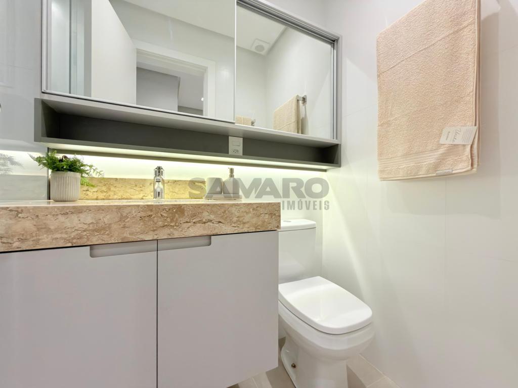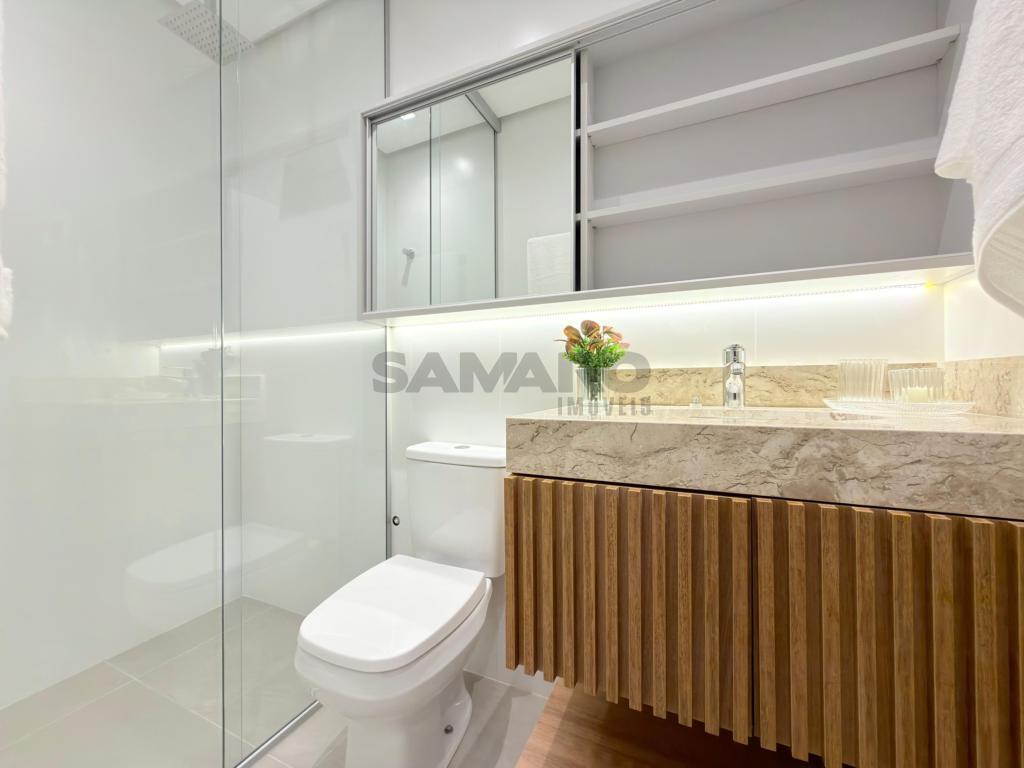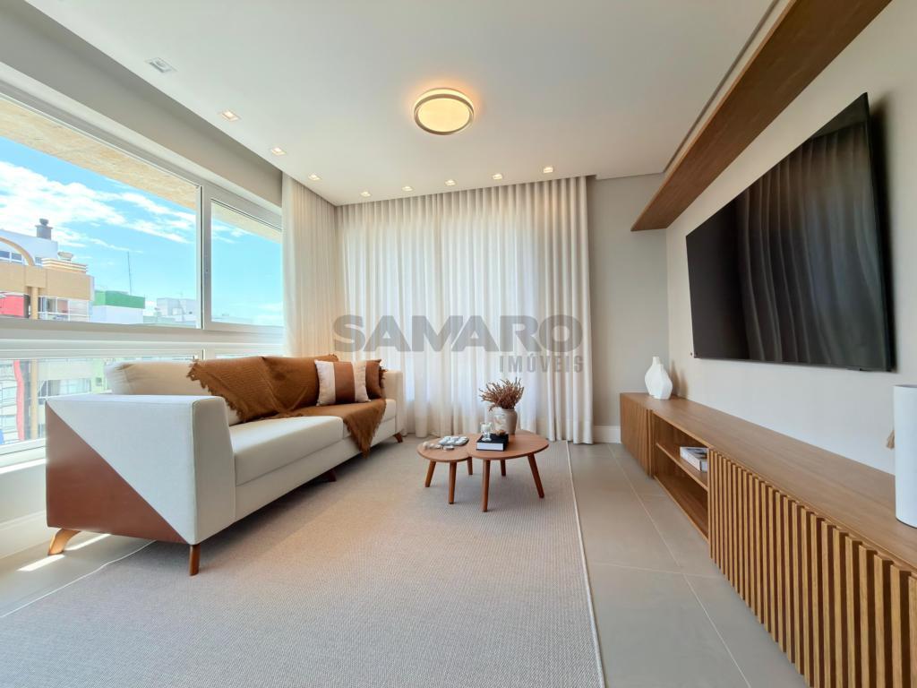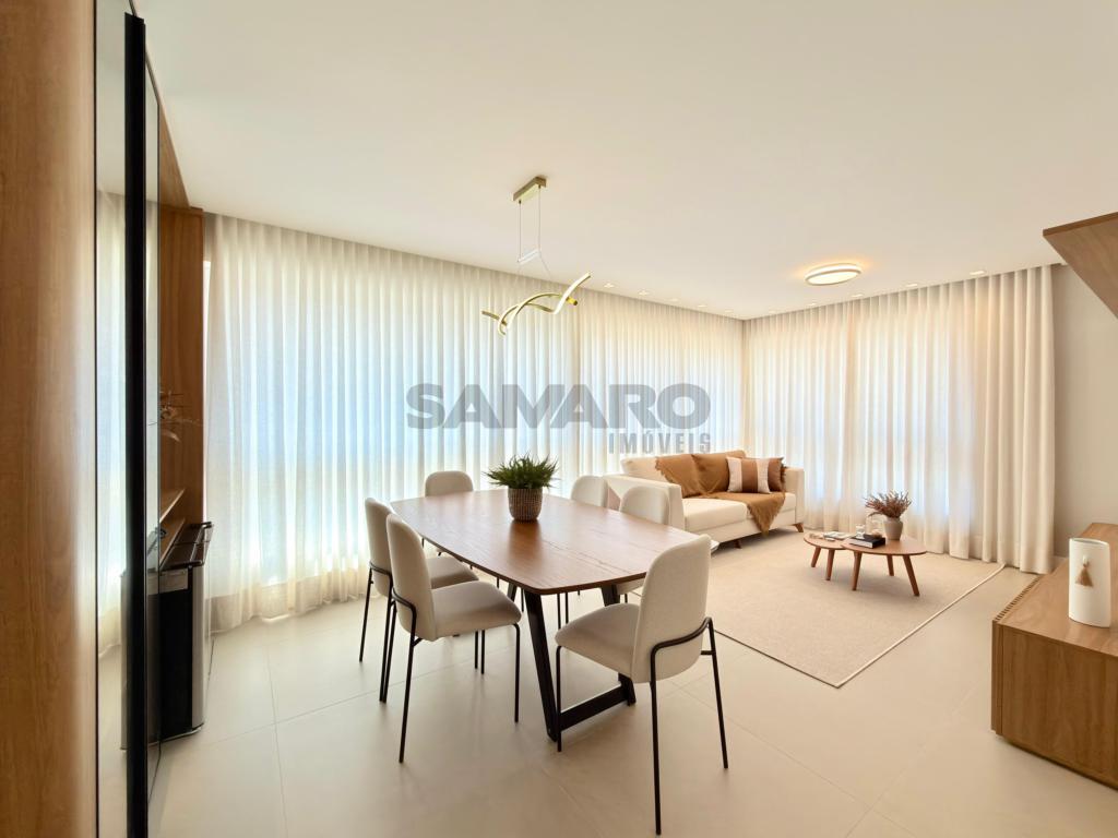 Apartamento de 03 dormitórios, suíte, lavabo, living estar/jantar, cozinha estilo americana com churrasqueira e lavanderia, orientação solar Leste/Norte, área total de 125,18 m², possui duas vagas de garagem, muito bem mobiliado e decorado.