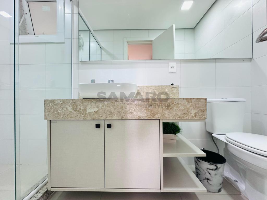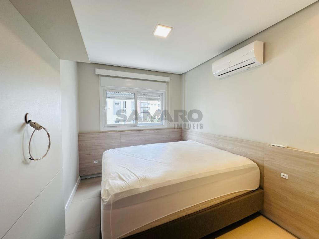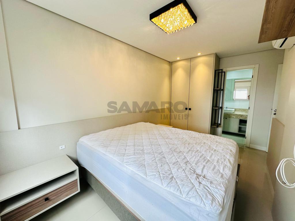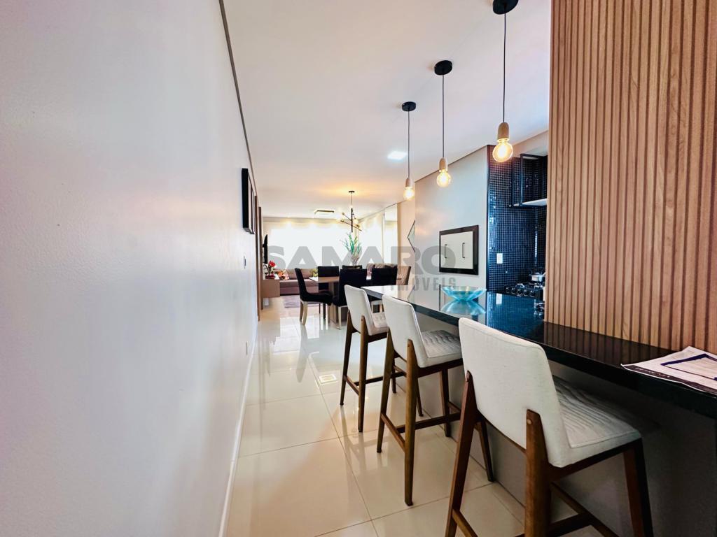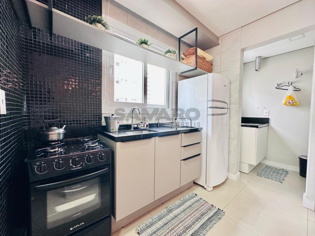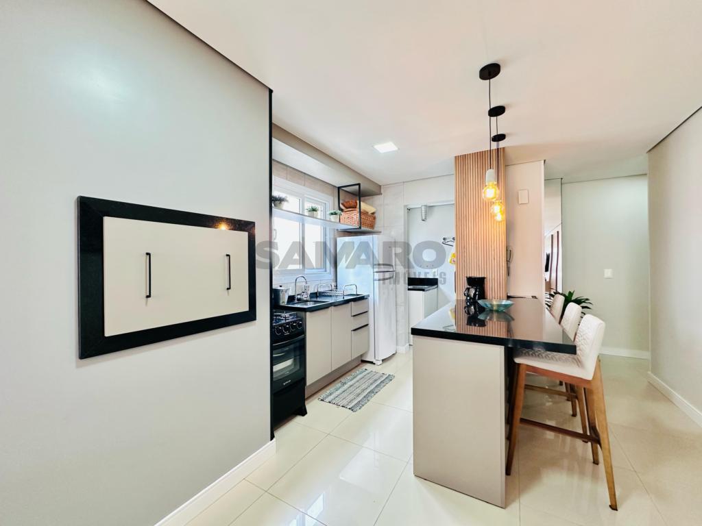 02 dormitorios, 01 suíte, banheiro social, living estar, jantar, cozinha estilo Americana com churrasqueira, lavanderia separada, mobiliado e decorado, box de garagem duplo.