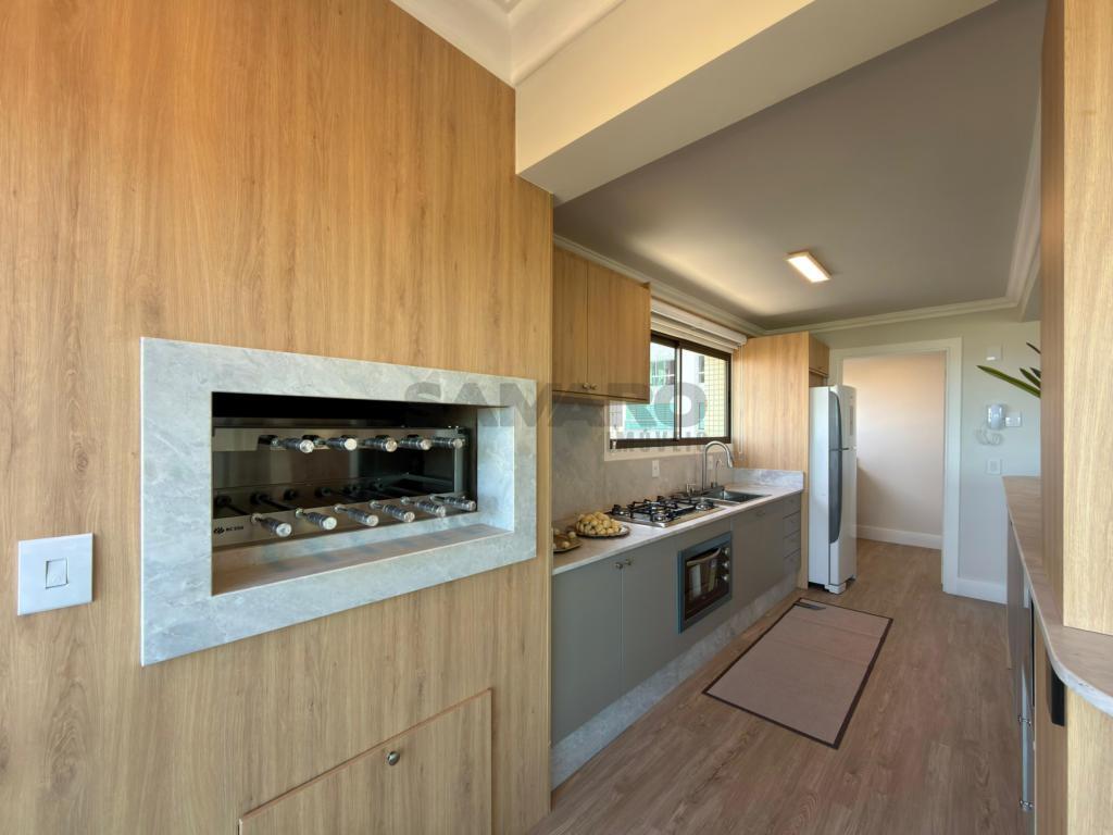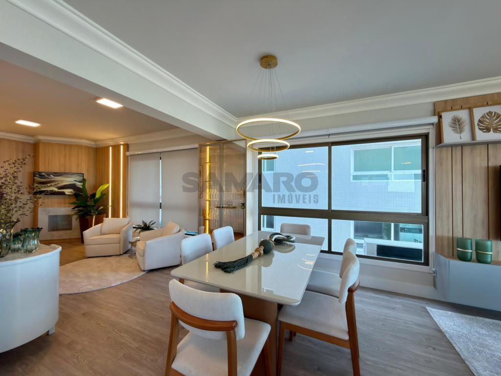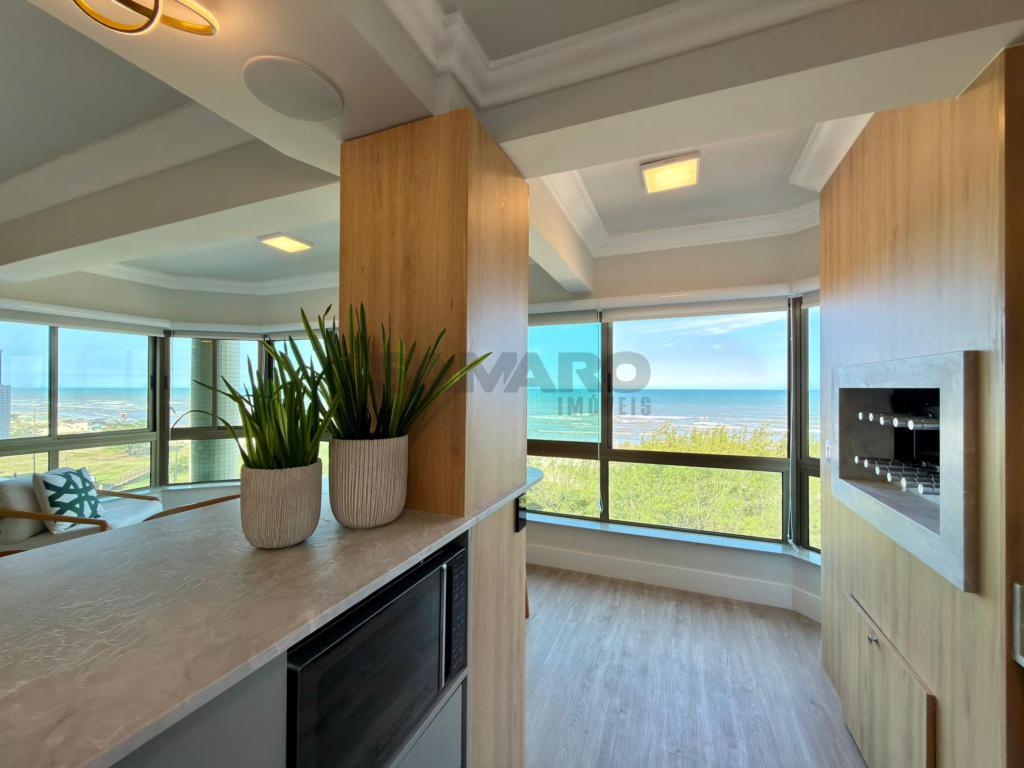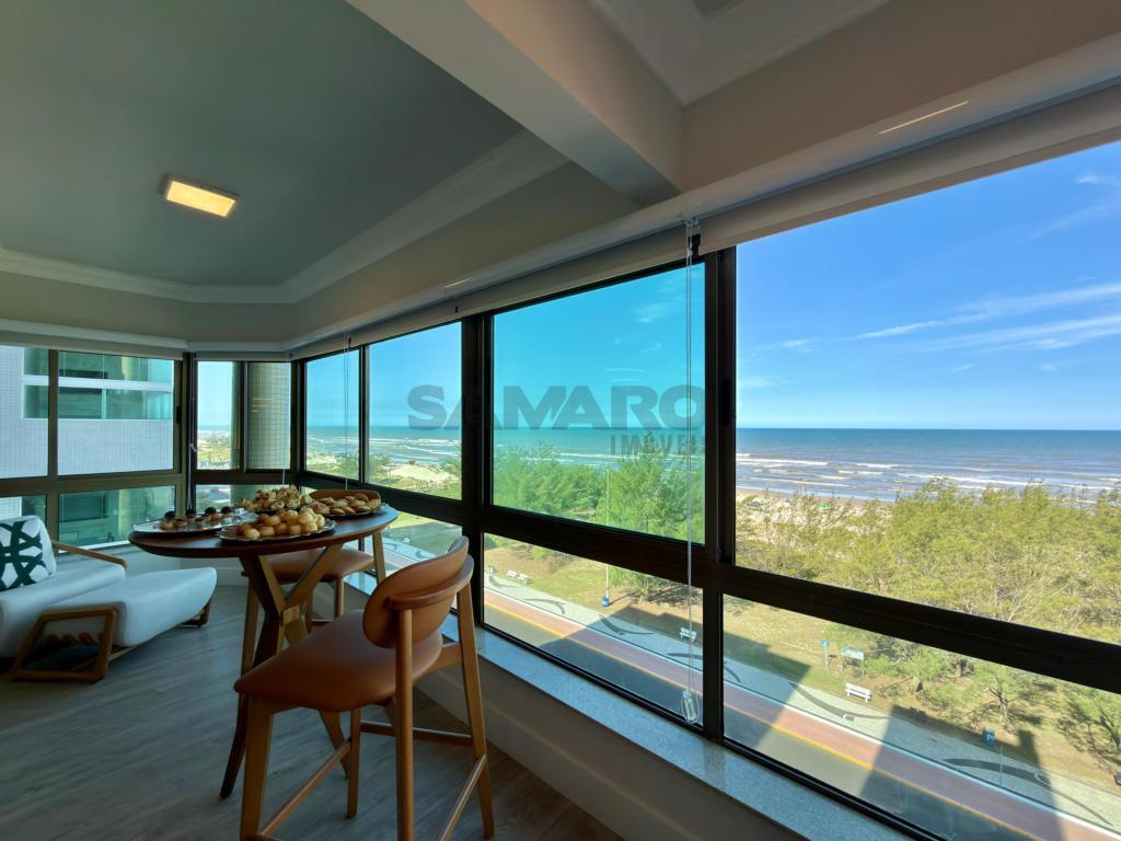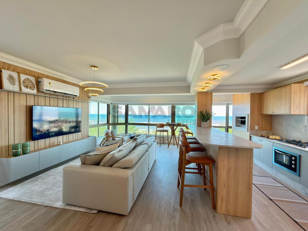 Apartamento 3 dormitórios, sendo todos suítes, lavabo, sacada de frente com churrasqueira e vista eterna mar e integrado ao amplo living três ambientes, cozinha americaa, lareira, todas as peças com iluminação solar direto rua, finamente mobiliado e decorado, três garagens + depósito.