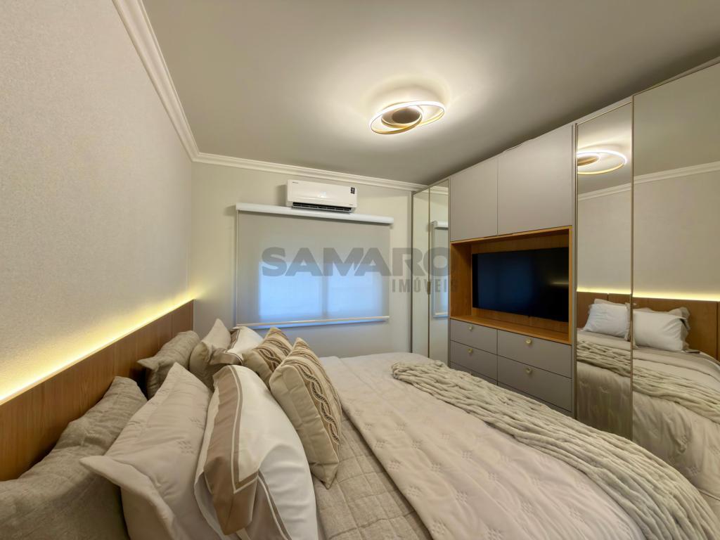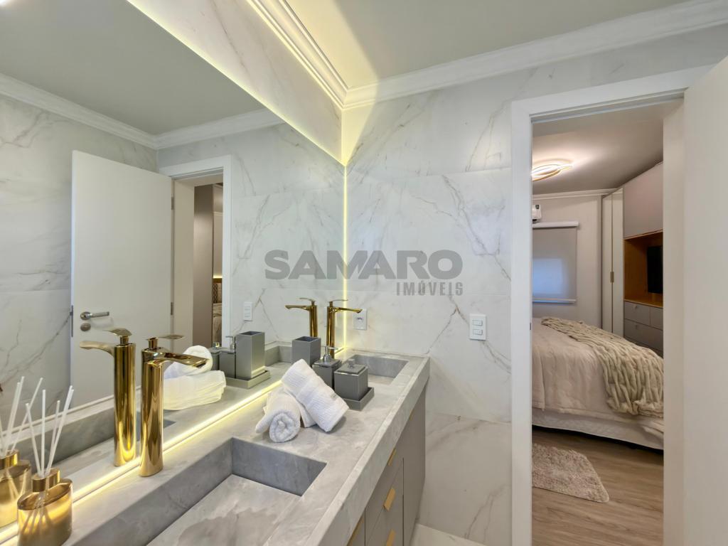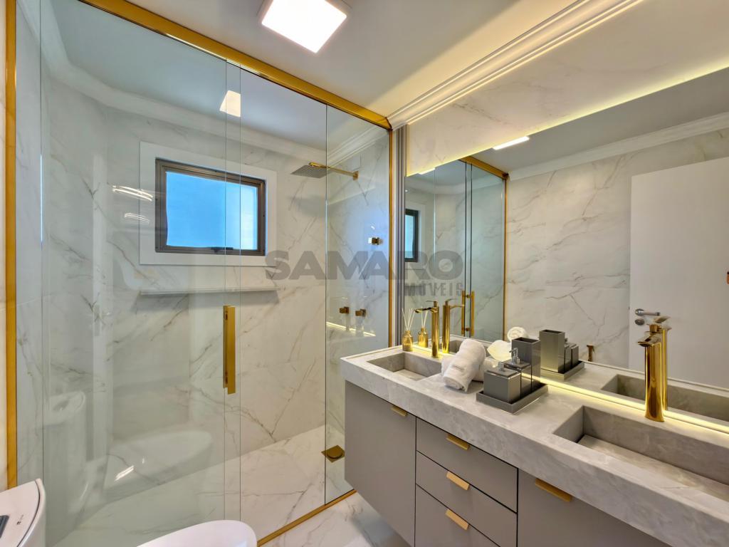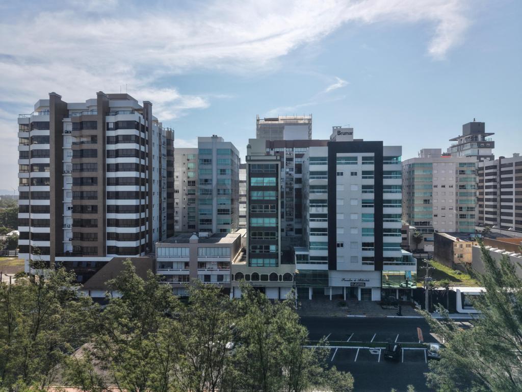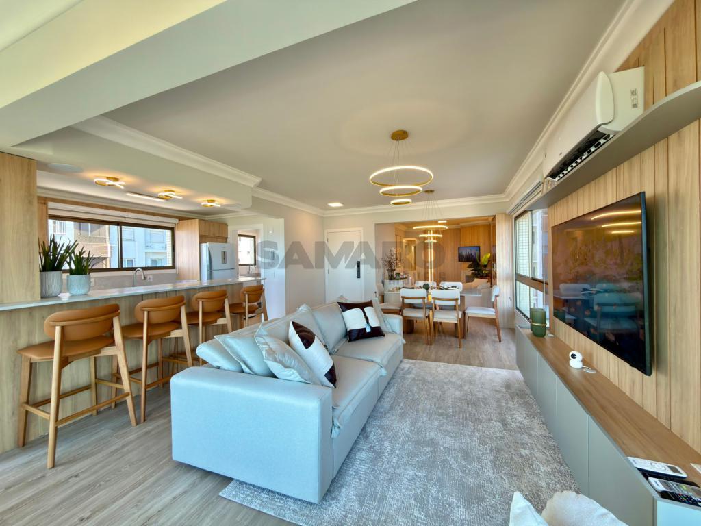 Apartamento 3 dormitórios, sendo todos suítes, lavabo, sacada de frente com churrasqueira e vista eterna mar e integrado ao amplo living três ambientes, cozinha americaa, lareira, todas as peças com iluminação solar direto rua, finamente mobiliado e decorado, três garagens + depósito.
