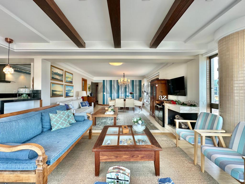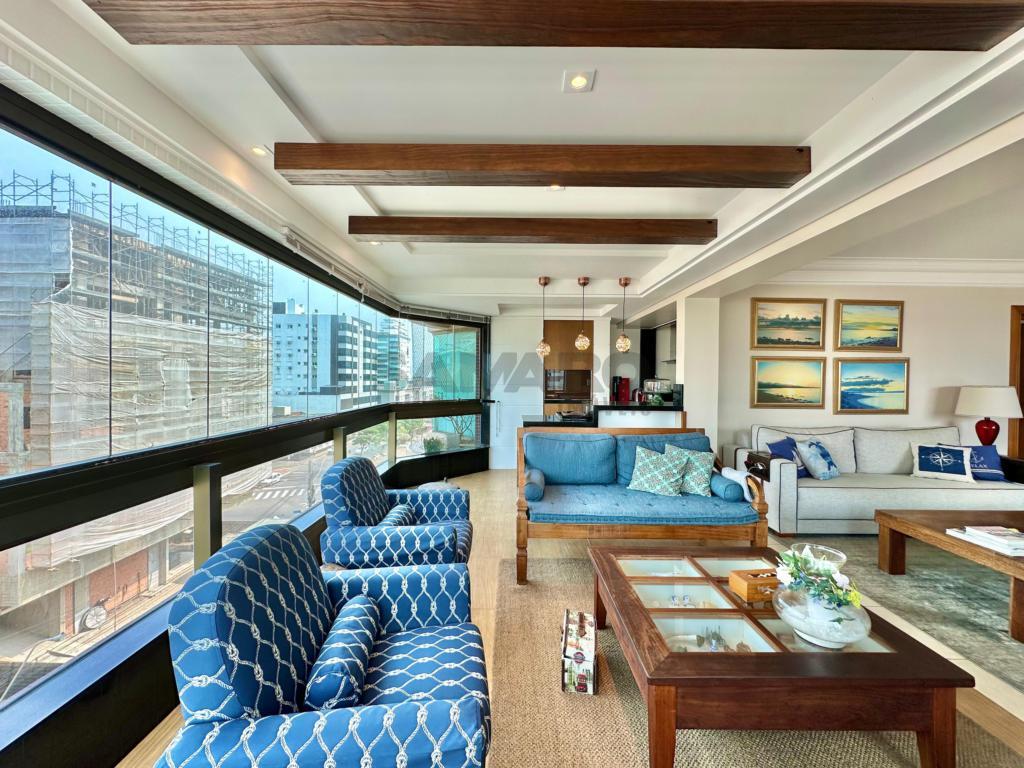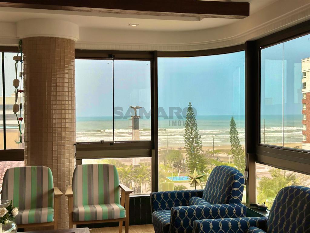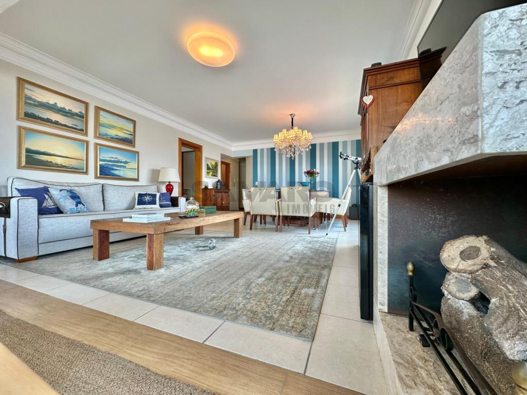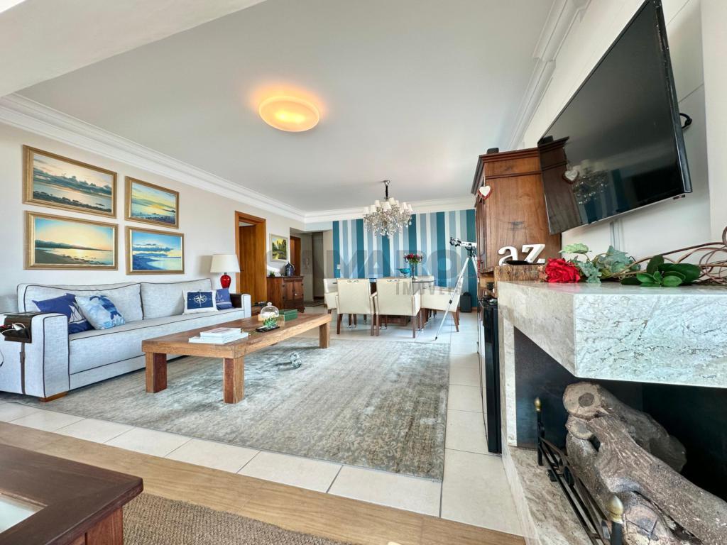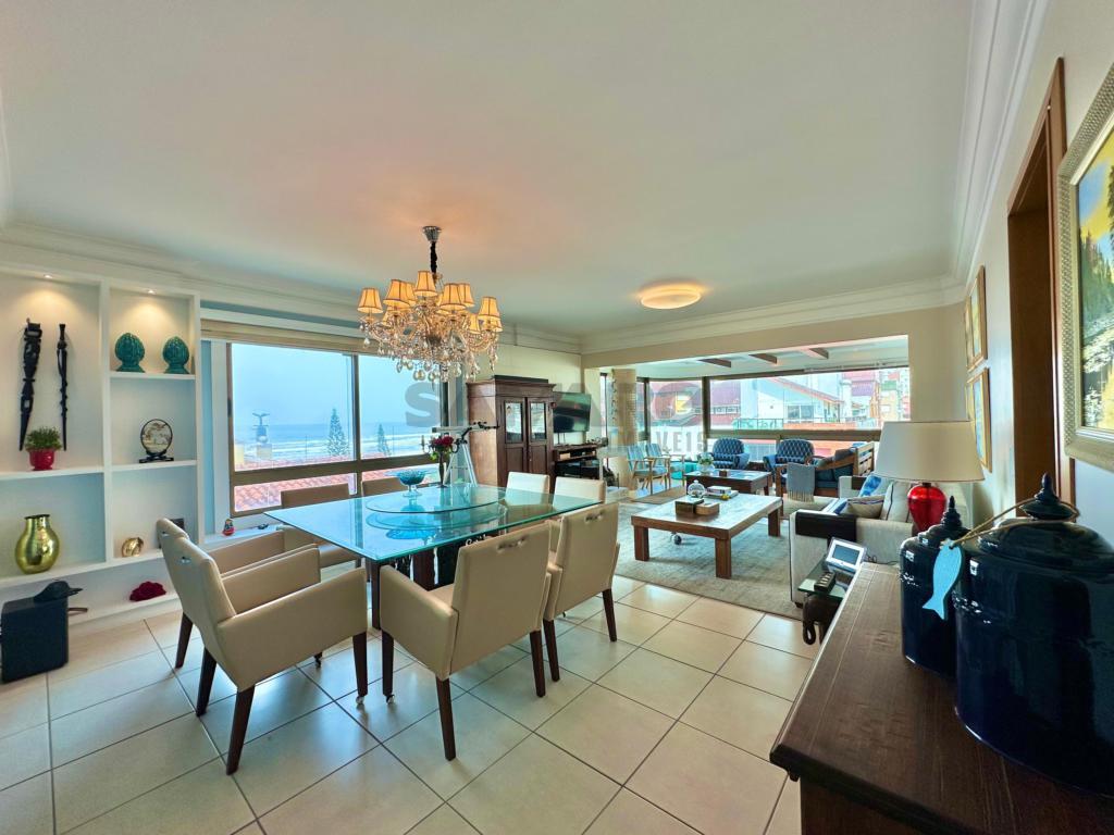 Apartamento com 4 dormitórios (sendo duas suites), banho social e lavabo, sala ampla em dois ambientes com vista para o mar, sacada de frente fechada com churrasqueira e espaço gourmet, mobiliado e decorado, cozinha separada com acesso á sacada de frente, dois box de estacionamento com um depósito, excelente ventilação natural e muito sol.