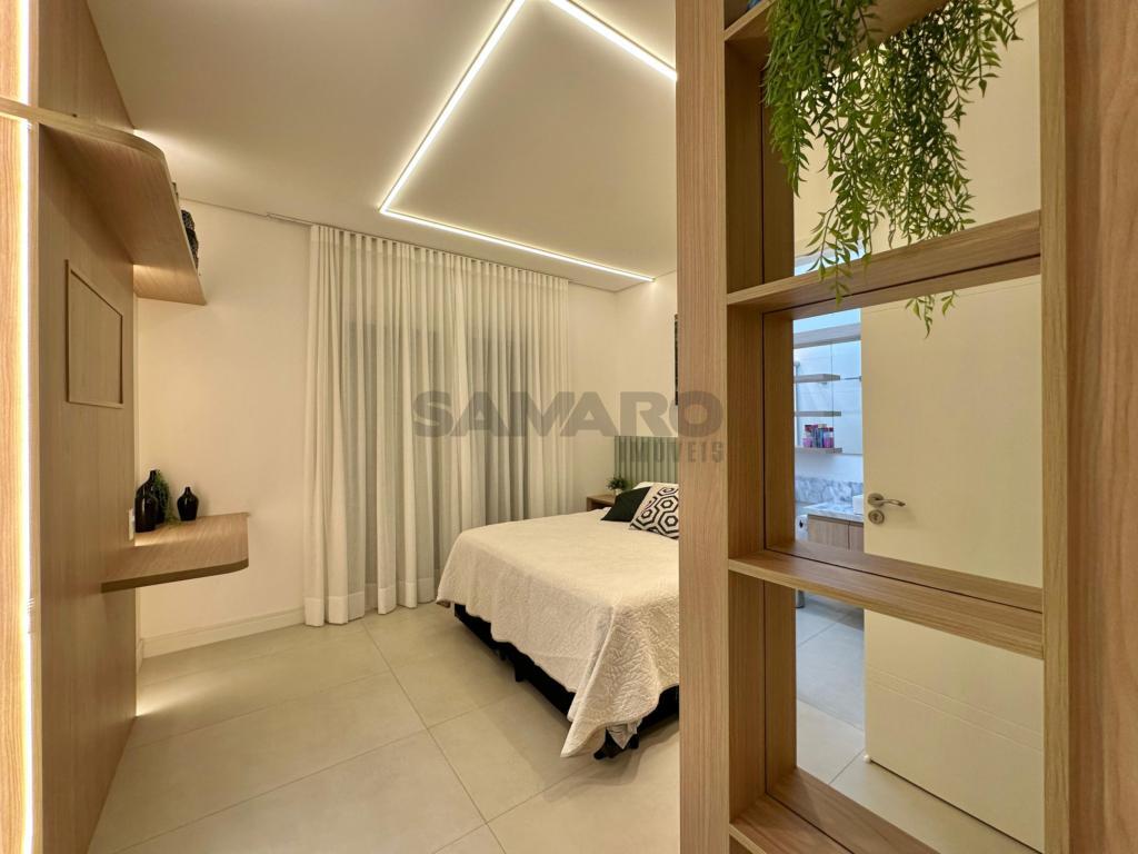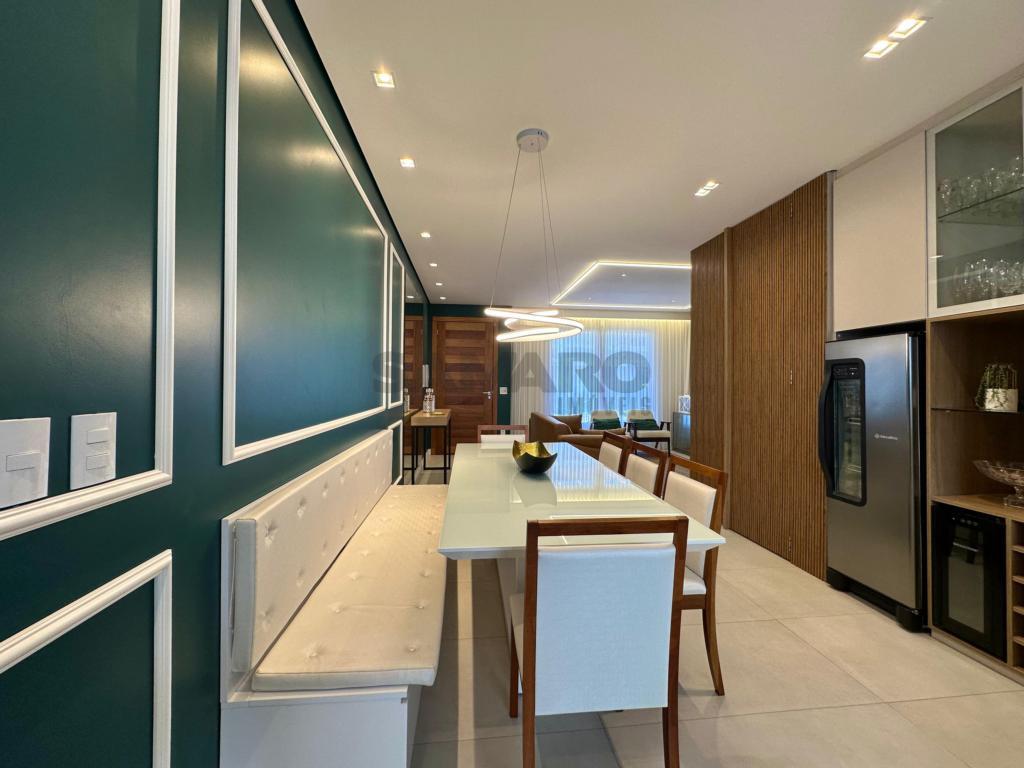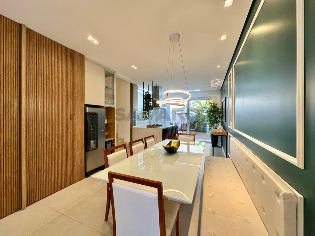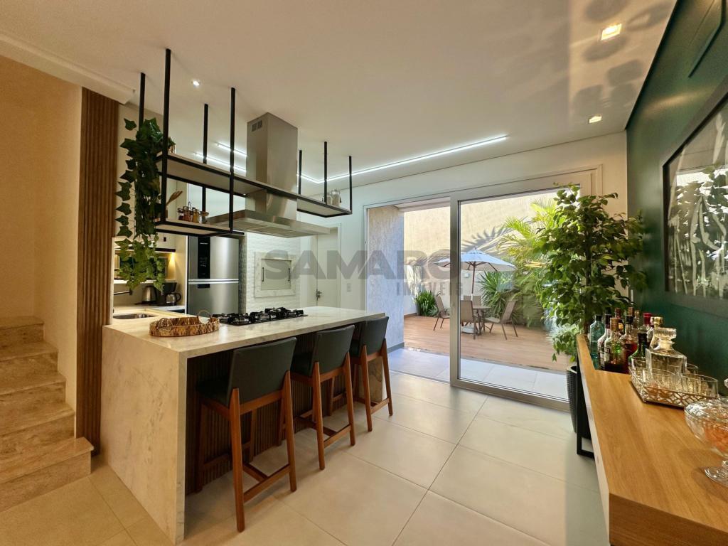 O Sobrado em condomínio fechado, mobiliado e decorado, 03 dormitórios sendo uma suíte, living integrado, lavabo, churrasqueira na cozinha, varanda estilo jardim de inverno nos fundos, água quente e gás central, piso porcelanato e aberturas em PVC. 02 vagas para carro.
