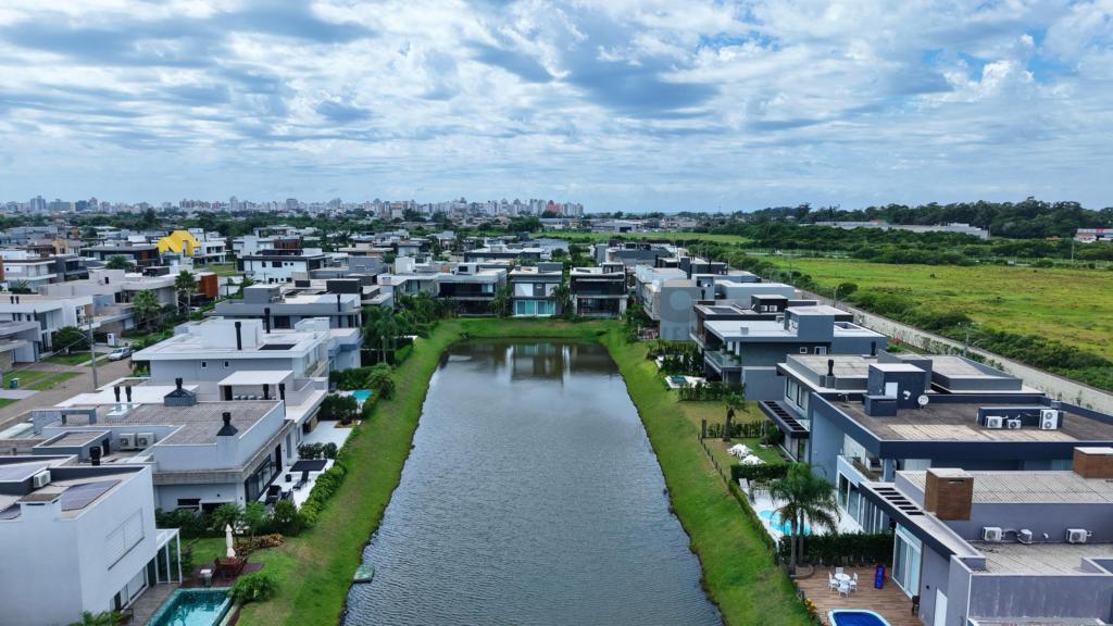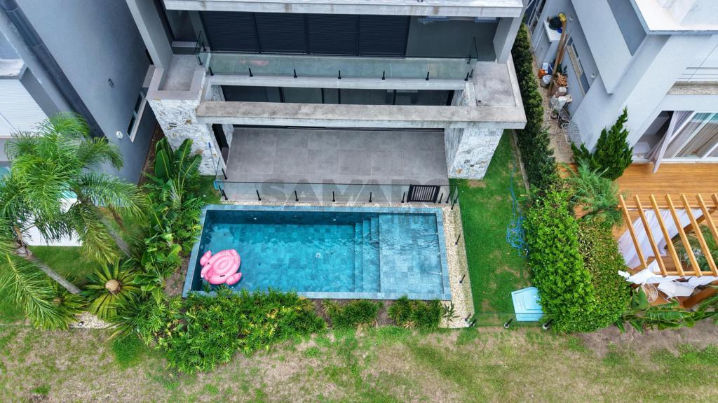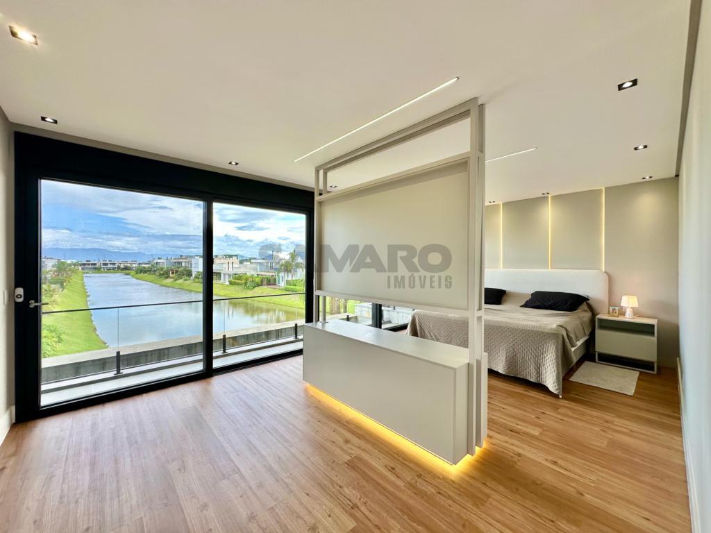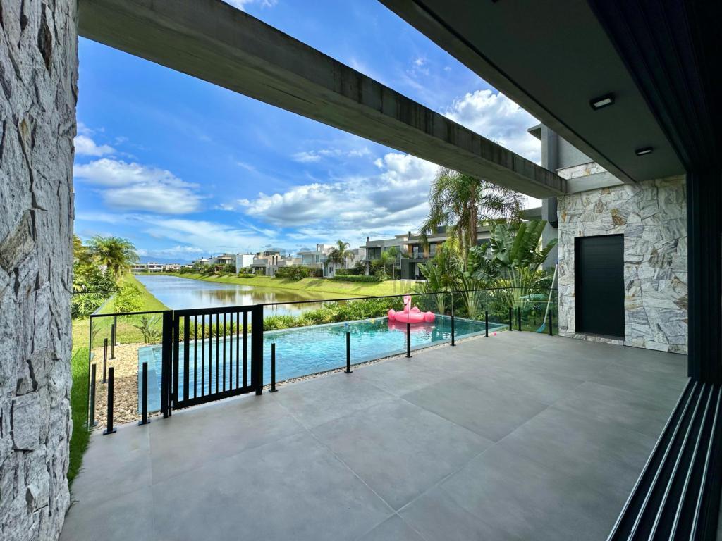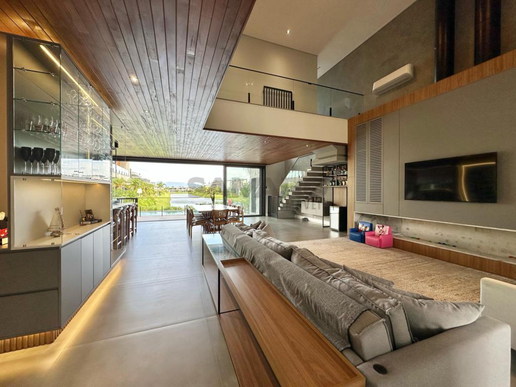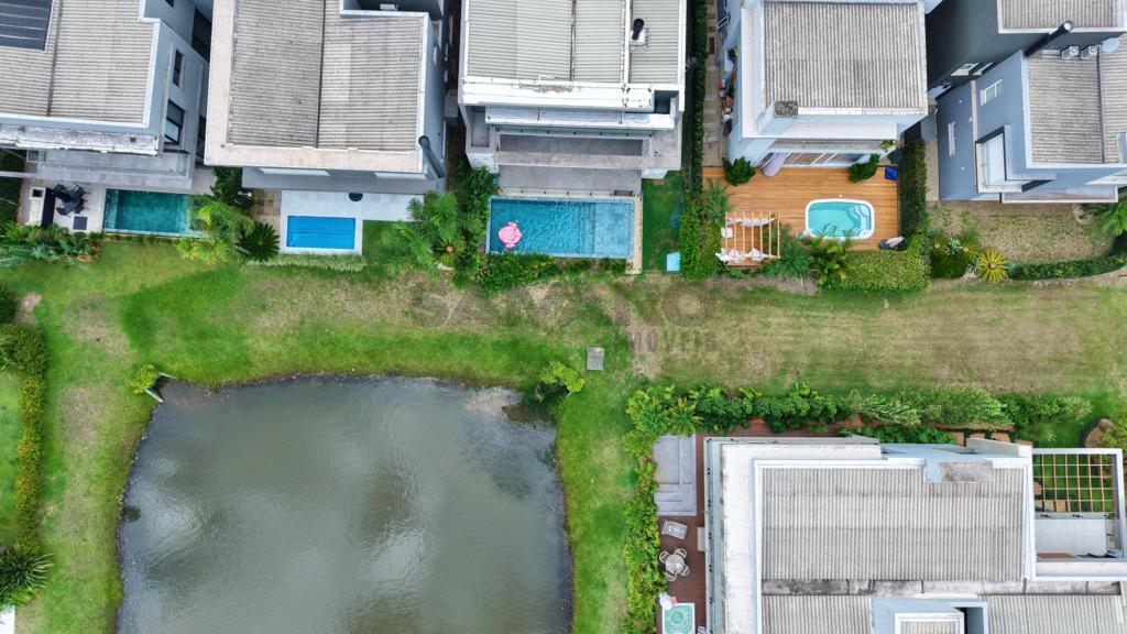 Sobrado com 335m² privativos,Beira lago ,04 suítes sendo uma Master térrea, lavabo interno e externopiscina,mobiliada e decorada com teto em madeira nobre,Pédireito duplo ,ambientes climatizados,esquadrilhas automatizadas em pvc preto,piscina aquecida 3x8 de concreto com iluminação, paisagismo e jardinagem, Segundo andar com piso vinílicoem todos os ambientes.vaga coberta para 02 carros