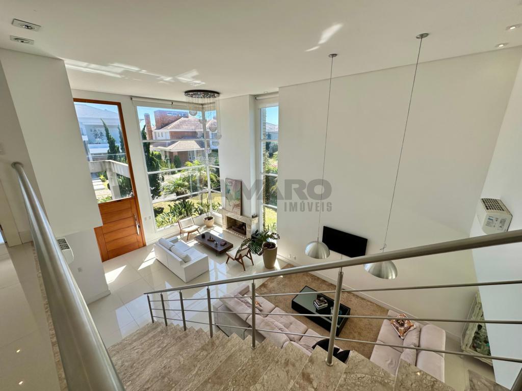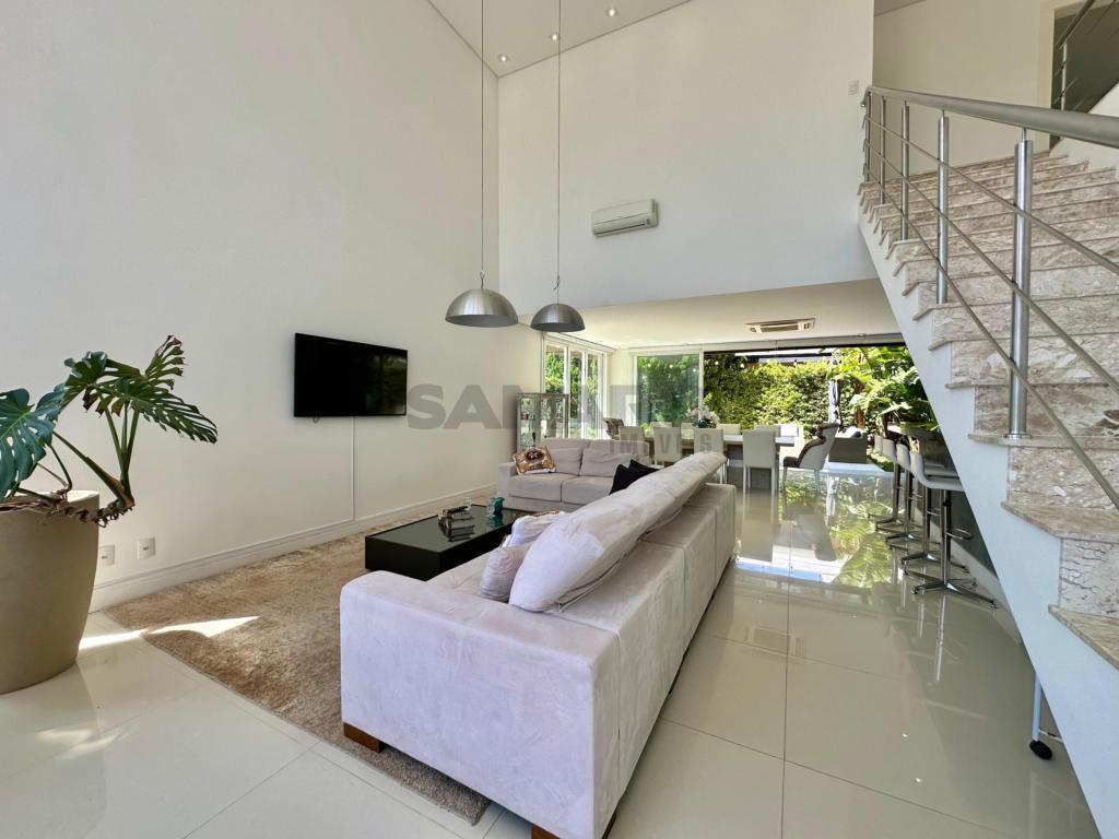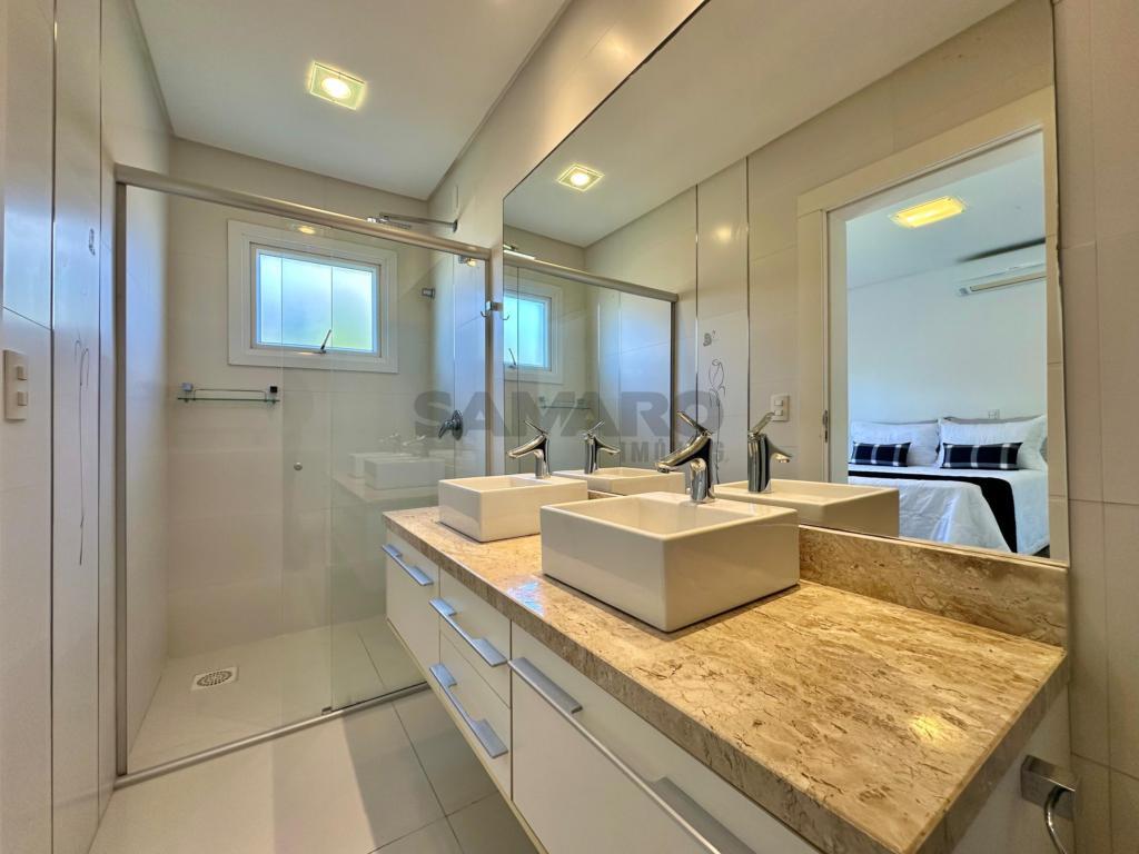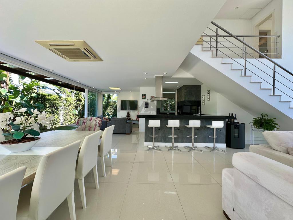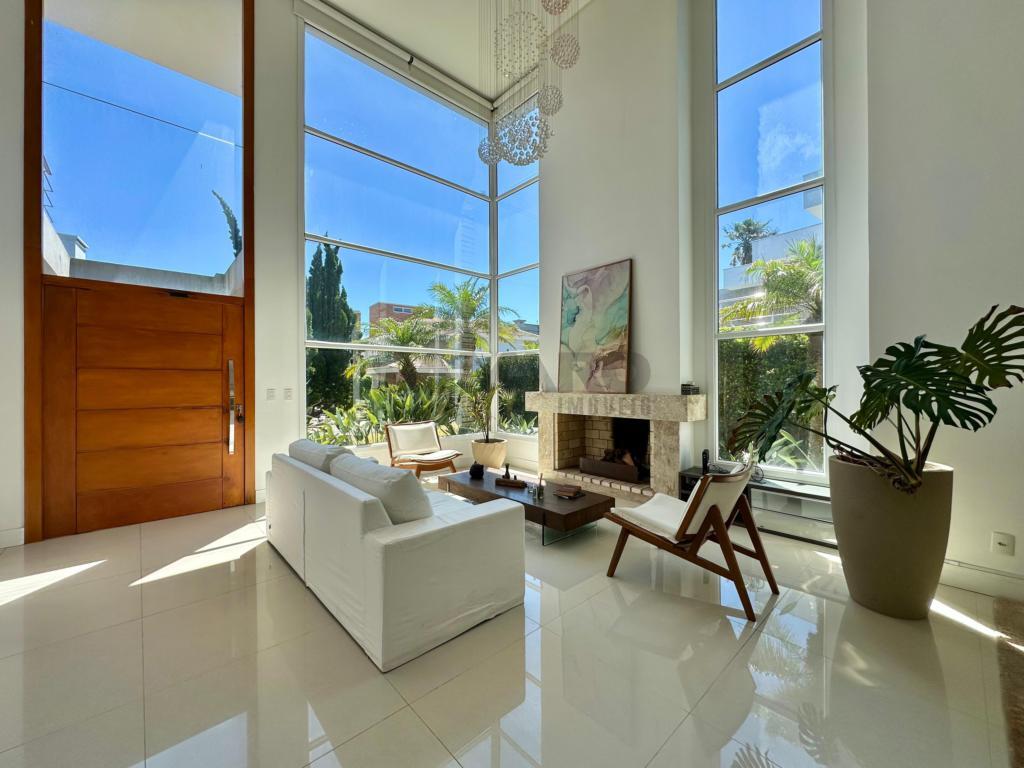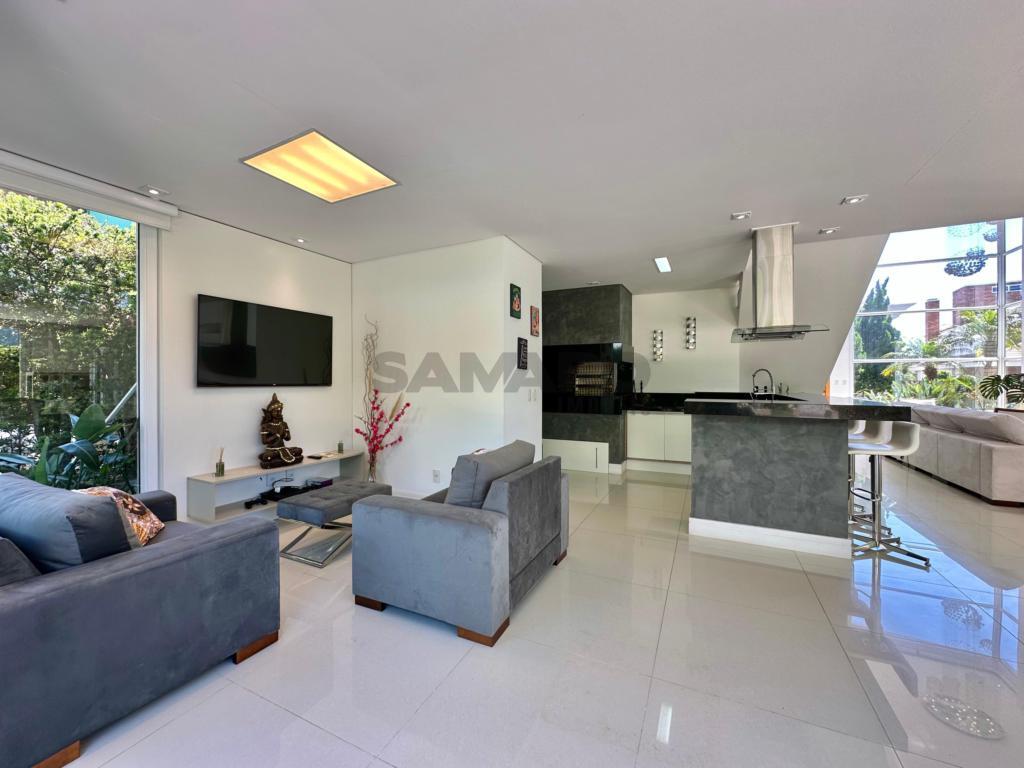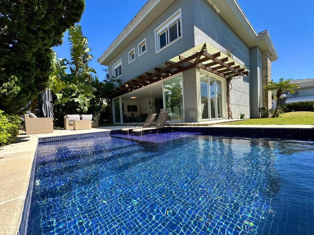 Sobrado com 05 suítes, sendo uma térrea e a master com closet e banheira, lavabo, amplo living com 4 ambientes (sala de estar com lareira, jantar, sala de jogos e e sala de TV. Cozinha gourmet com churrasqueira, área de serviço, dependência de empregada completa, abrigo para dois carros, piscina em concreto. 300m² de área privativa (fora áreas externas como sacadas e abrigo)