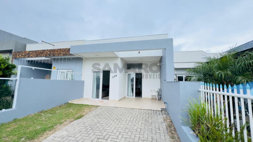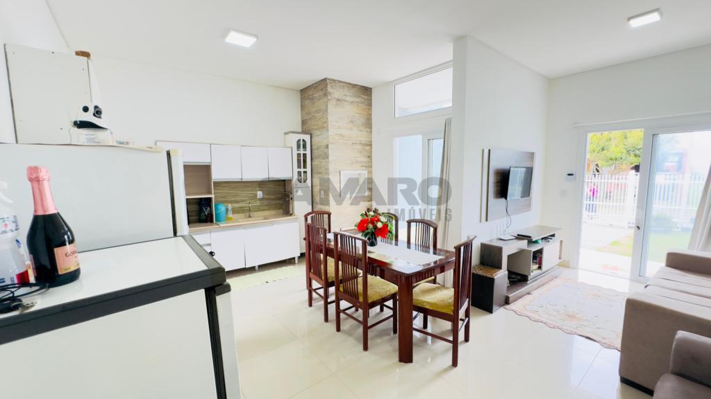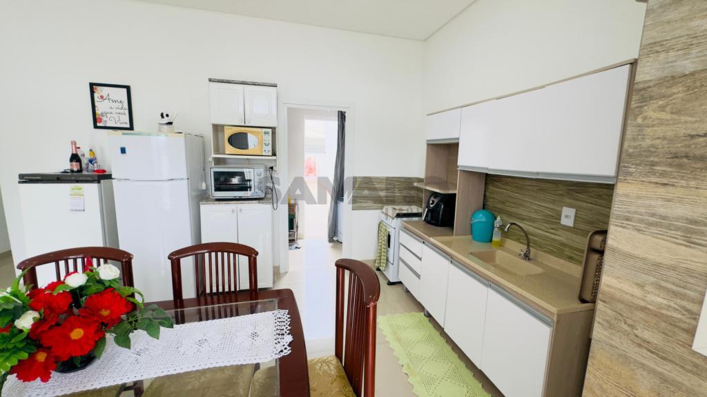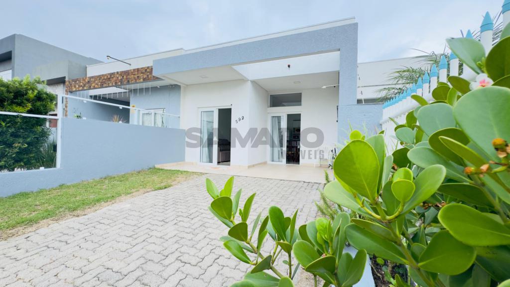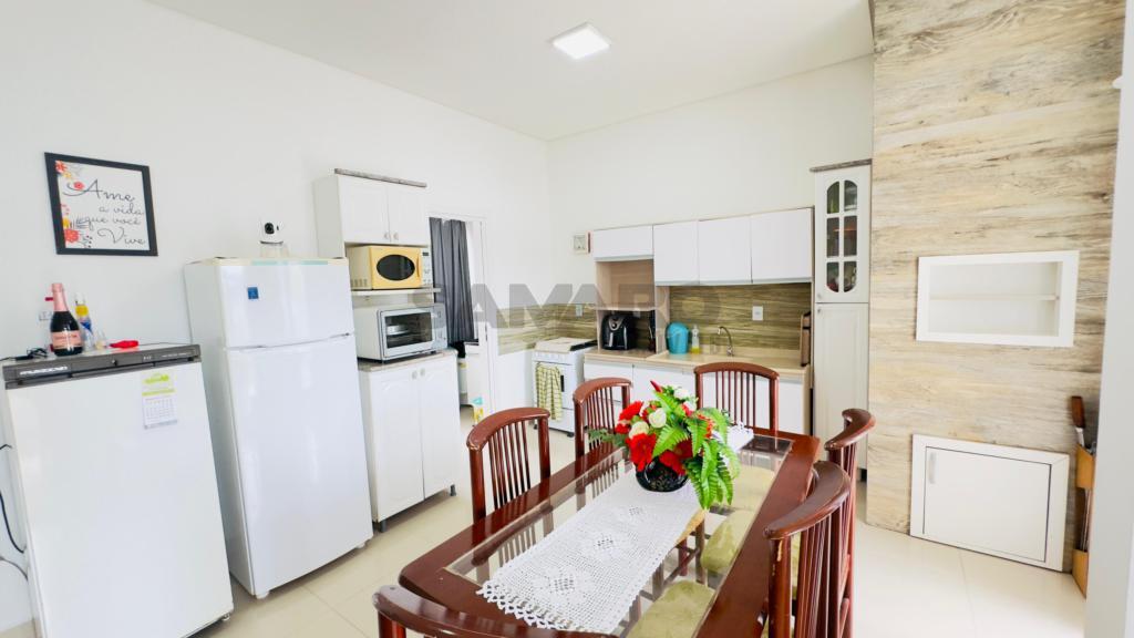 Casa de 2 quartos súites, lavabo, cozinha com churrasqueira, living 2 ambientes e área para descanso na entrada, aberturas em PVC, pé direito alto, piso porcelanato, mobiliado, área de serviço separada, pátio na frente e na lateral calcado, espaço para varal nos fundos, garagem aberta, possibilidade de dois carros no pátio da frente, cerca em PVC.