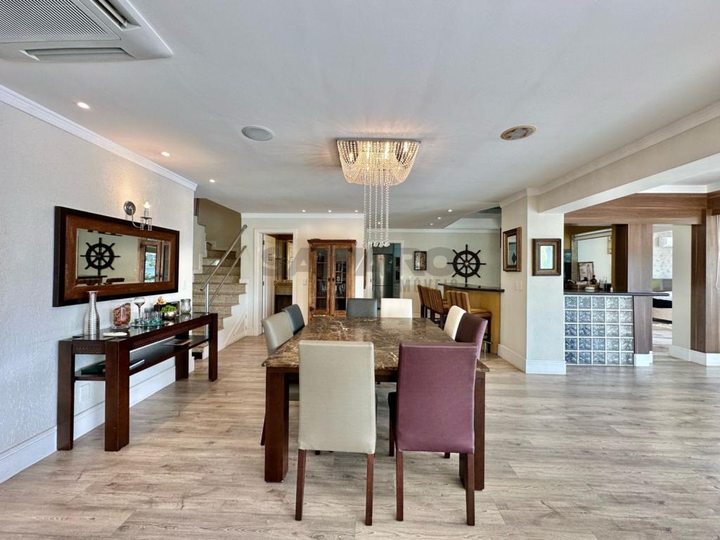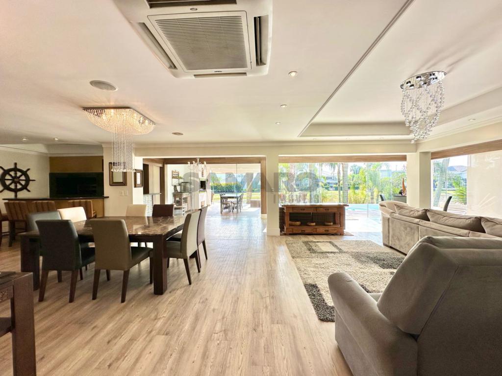 5 suites (1 master com hidro), lavabo, mobiliada e decorada, gourmet com bancada americana, área de serviço, dep de empregada, piscina com hidro e aquecimento elétrico, 2 trapiches priv, área gourmet externa, fundos com 26m de lago, paisagismo e iluminação.