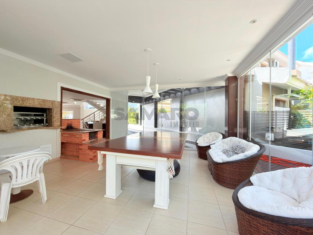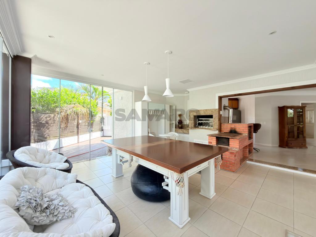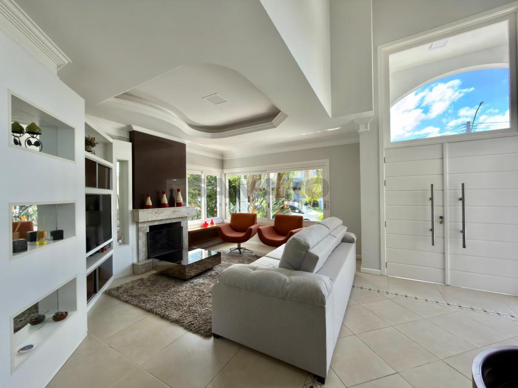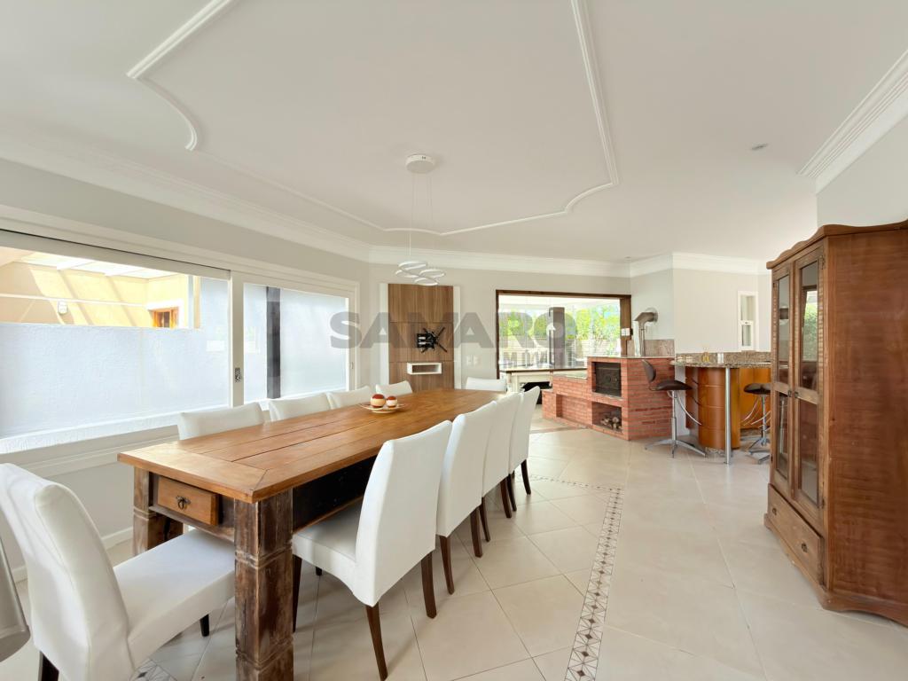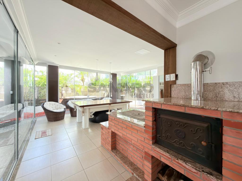 Casa em condomínio fechado de alto padrão com aproximadamente 280 metros, 4 suítes(sendo uma térrea), living amplo em três ambientes integrados, espaço gourmet com churrasqueira, e fogão campeiro, cozinha estilo americana, área de lavanderia, vaga de garagem, pátio com paisagismo e jacuzzi, todos os ambientes climatizados, água quente e uma excelente iluminação natural.